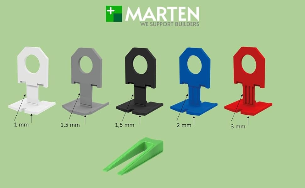 Система Marten-Level усуває необхідність використання стандартних хрестиків і використання кліщів та інших додаткових інструментів. Виготовлена з гнучкого матеріалу, вона запобігає пошкодженню плитки на її кутах. Він складається з одноразових відривних затискачів, які виступають опорою для плитки. Система підходить для вирівнювання плитки різних типів, розмірів і товщини. Допомагає швидко і легко укладати плитку, економлячи час і забезпечуючи ефективність роботи плиточника. Продукт призначений як для професіоналів, так і для любителів DIY.