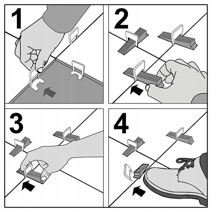Професійний набір клиногубців і кліпс для вирівнювання плитки. Ідеально підходить для укладання плитки або плитки для підлоги. Встановлення займає кілька секунд, і плитки вирівнюються одна з одною.