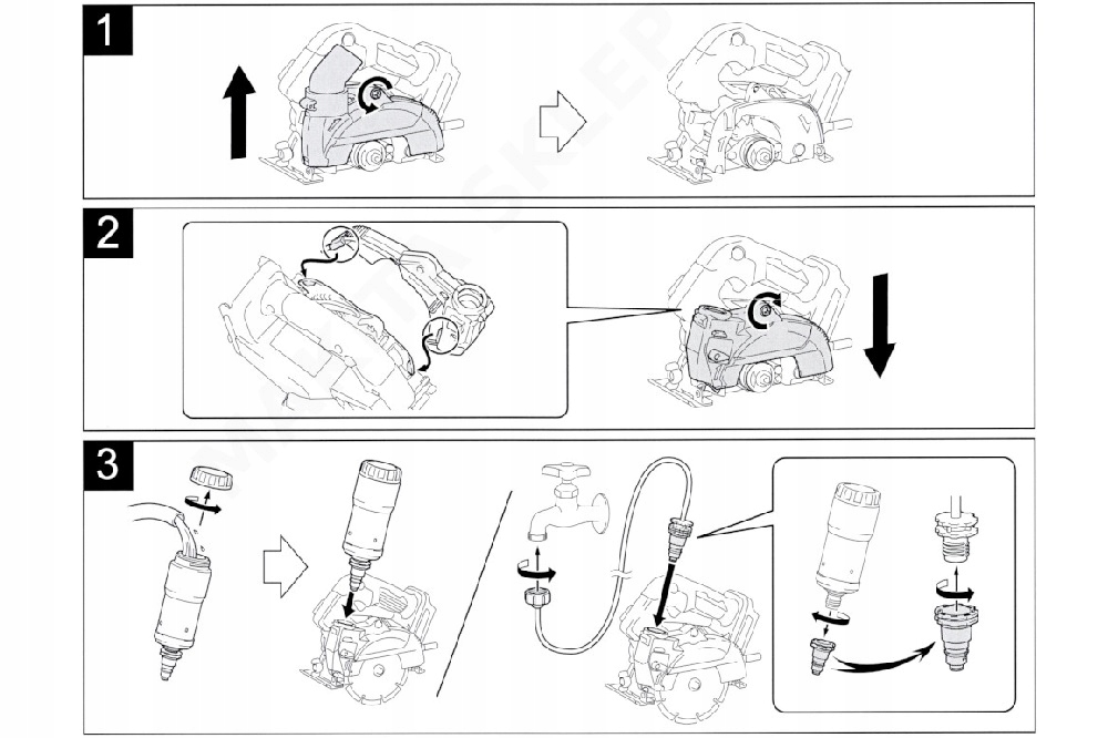 - Кожух для мокрого різання з резервуаром для води та шлангом для підключення водопровідної води