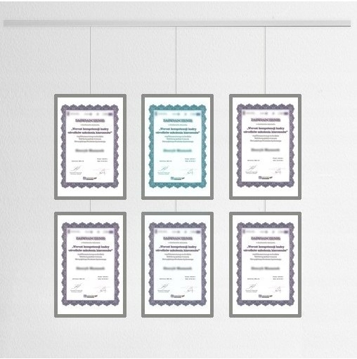 Система вручення дипломів - це готове рішення, яке дозволяє створити власну галерею з нагородами, сертифікатами та дипломами, але не тільки. Практичний і дуже функціональний спосіб, який дозволяє підвішувати рамки на мотузках без додаткового свердління отворів у стіні. Головною перевагою рішення є його надзвичайна гнучкість - вам вирішувати, як розташувати рами. Ви можете в будь-який момент змінити їх розташування, додати або прибрати вибраний об'єкт, Ви лише кріпите рейку (смугу) до стіни. Ви вставляєте потрібну кількість шнурів у його напрямну та розміщуєте на них гачки рами – готово! Приклади використання: юридичні контори, медичні кабінети, салони краси, туристичні агентства.