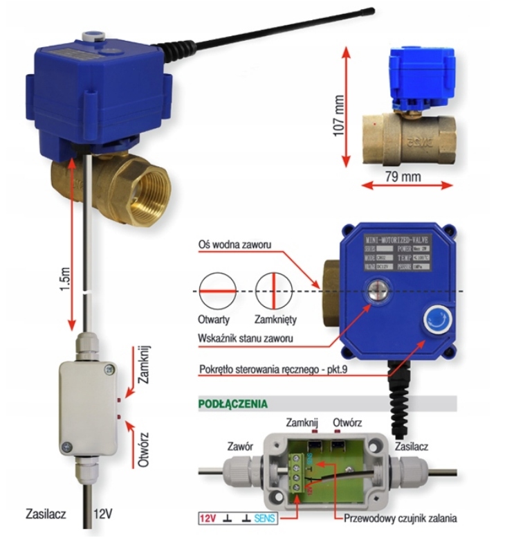 Перевірте, чи є батареї (9 В) у датчиках затоплення. Датчики повинні бути зареєстровані в клапані, а потім розміщені в приміщеннях, схильних до затоплення (кухня, ванна кімната, туалет, котельня тощо). Тепер перевіряємо роботу системи, доторкаючись, наприклад, мокрим пальцем до металевих електродів, розташованих у нижній частині датчиків, що повинно викликати сигнал тривоги на датчику та відправити команду ЗАКРИТИ на клапан. Перевіряємо, чи виконав клапан команду.