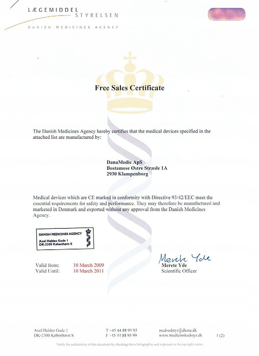 Пристрій зареєстровано як пристрій Датським медичним агентством медичний.