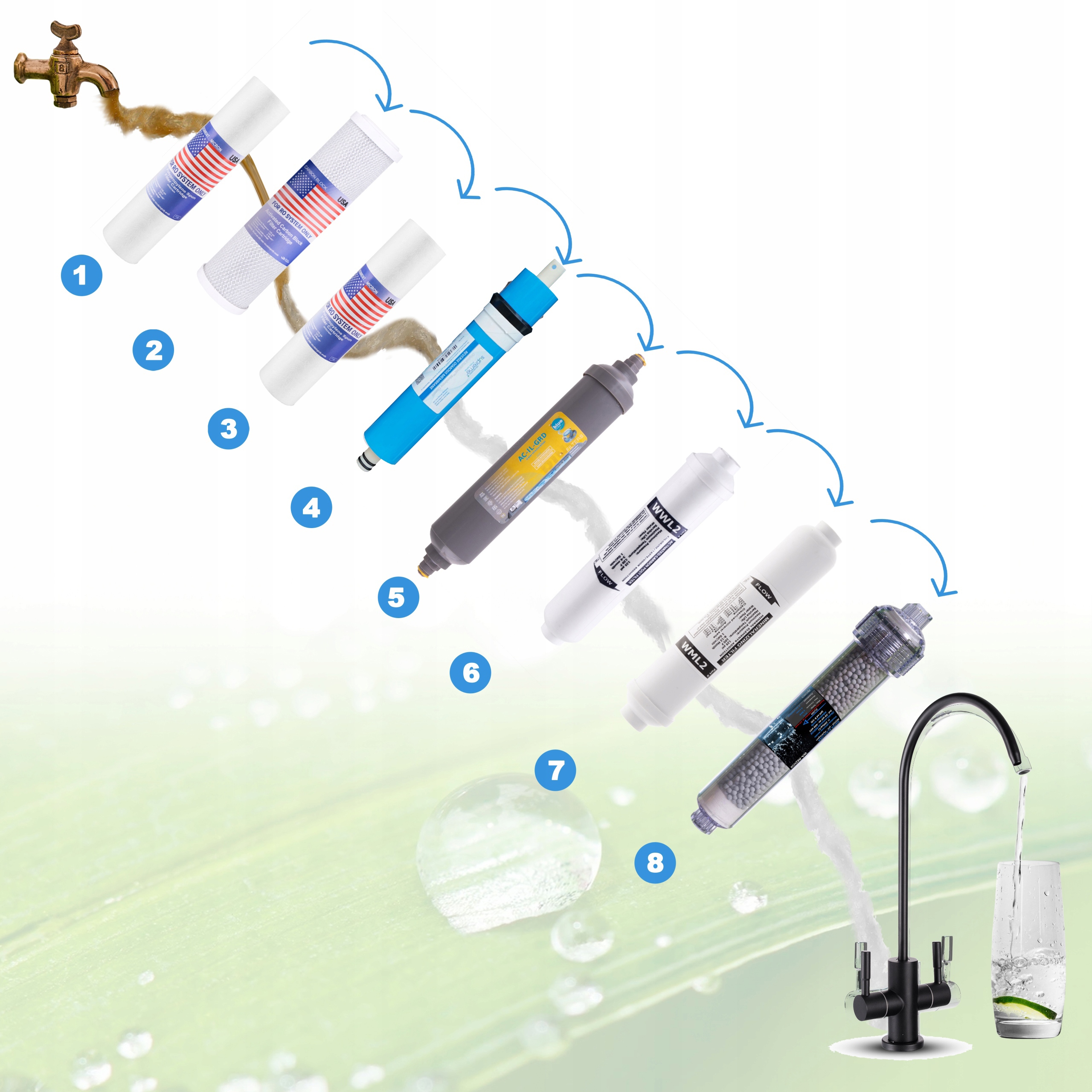 Вода, що протікає через систему, піддається 8-ступінчастій фільтрації, яка складається з: