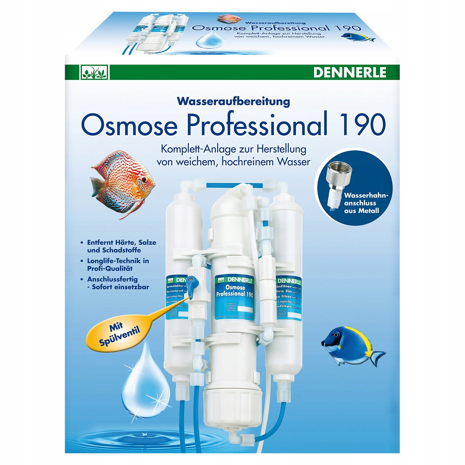 За допомогою Dennerle Osmose Compact 190 ви можете легко виготовити власну осмотичну воду в мить ока! Система відразу готова до підключення, завдяки підключенню води ¾ може почати працювати відразу. Максимальна потужність (номінальна потужність) становить 190 літрів на добу при 25°C і тиску 4,1 бар. Продуктивність в практичних умовах становить 80-185 літрів на добу при температурі 8-18°С і тиску 3-5 бар. Рівень збереження становить не менше 95%. Співвідношення осмотична вода: залишкова вода становить приблизно від 1:2,5 до 1:4 (залежно від температури і тиску водопровідної води). Система має сучасну поліамід-полісульфонову мембрану, фільтри з активованого вугілля захищають від хлору, а фільтр тонкого очищення захищає від суспензії.