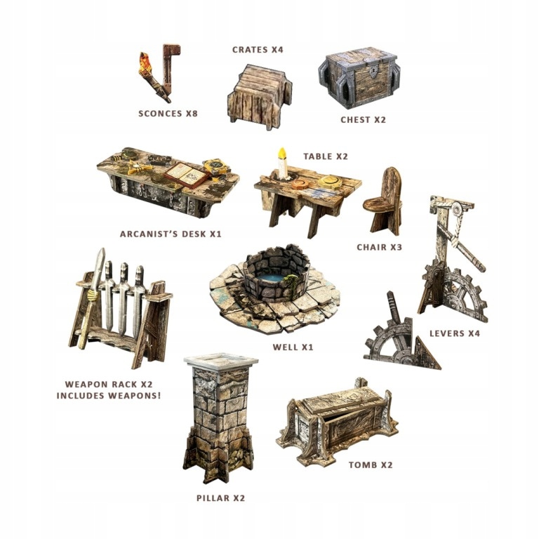 Ця коробка містить всю область, яка вам потрібна для одноразового підземелля або інтер'єру замку, придатного для багатьох фантазійних ігор та RPG. Він містить широкий вибір настінних систем, інтерактивних меблів підземелля та вибір пасток та елементів цілей. Набір повністю модульний і може бути складений у будь -якій вибраній комбінації, щоб щоразу отримувати іншу конфігурацію. Крипт можна розширити з іншими наборами з серії Battle Systems.