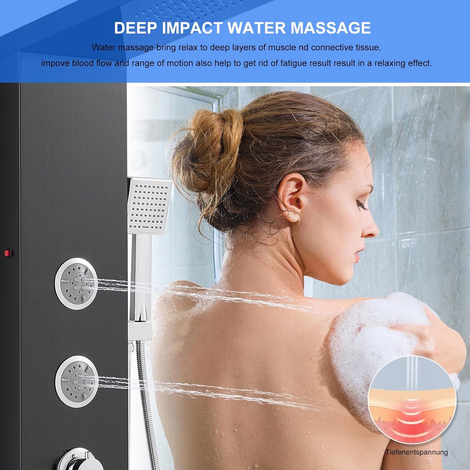 - Різний масаж тіла відповідно до вашої волі: завдяки 2 режимам (гідравлічному режимі та режимі розпилення води) кожен з них, ви можете використовувати ці 3 потоки тіла на душовому стовпчику з їх різними комбінаціями масажу. Насадка тіла може забезпечити масаж всього тіла, і два режими можна вільно поєднувати, щоб використовувати різні режими масажу для різних частин тіла. Після кожного душу ваші м’язи розслабляються, кровообігація вдосконалюється, втома зникає, і ви відчуваєте себе освіженим і відпочиваючим