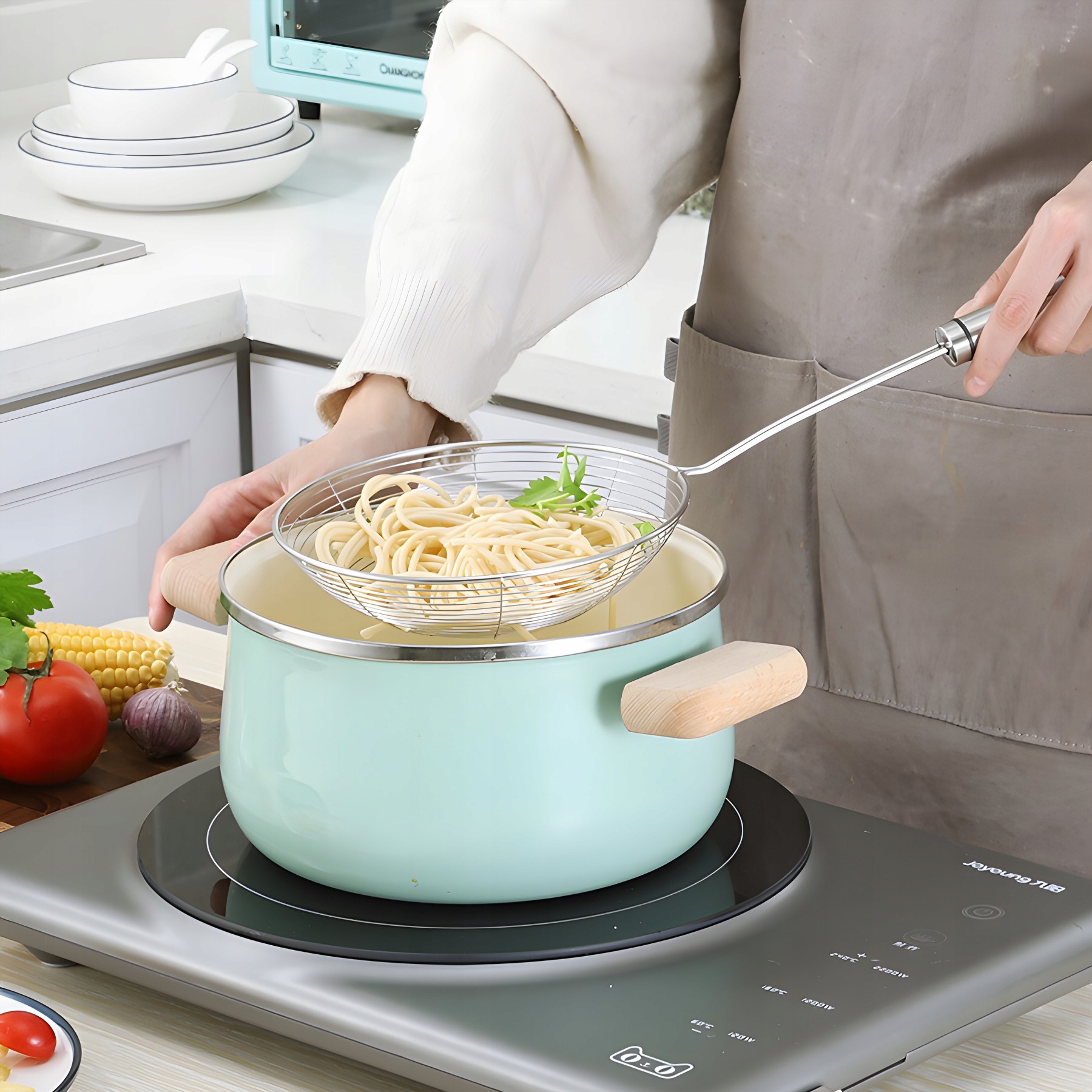 Завдяки дротяній решітці їжа розміщується безпечно, що зводить до мінімуму ризик бризок олії та забруднення навколо плити. Це ідеальний інструмент для смаження картоплі фрі, риби, пончиків, овочів, зварених круто яєць, макаронних виробів, м'яса, морепродуктів і багатьох інших страв. Крім того, його можна використовувати в поєднанні з різними інструментами для смаження, що робить його універсальним рішенням на кухні.