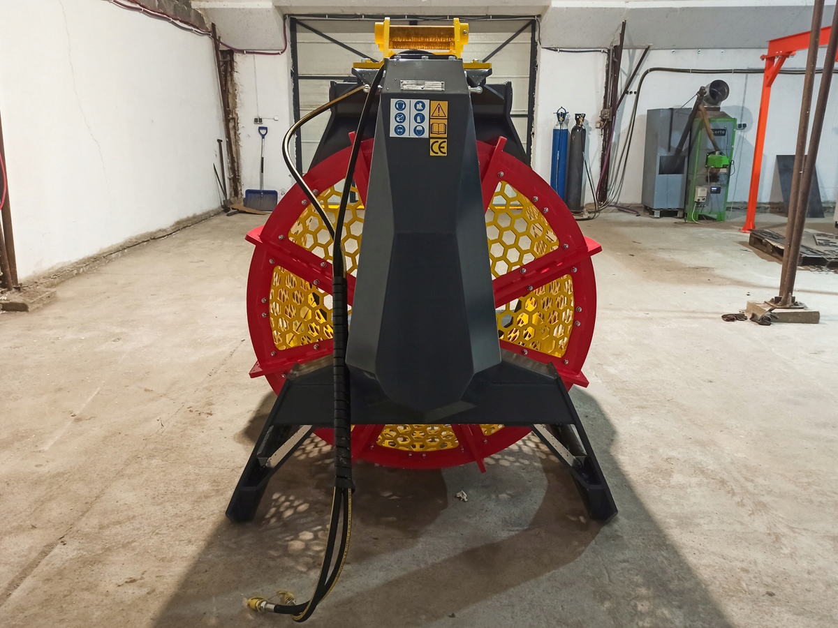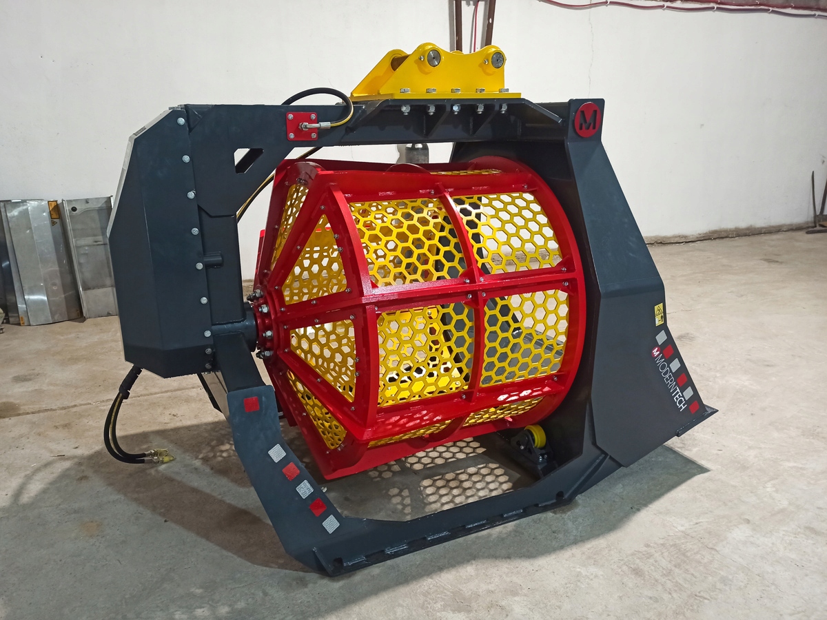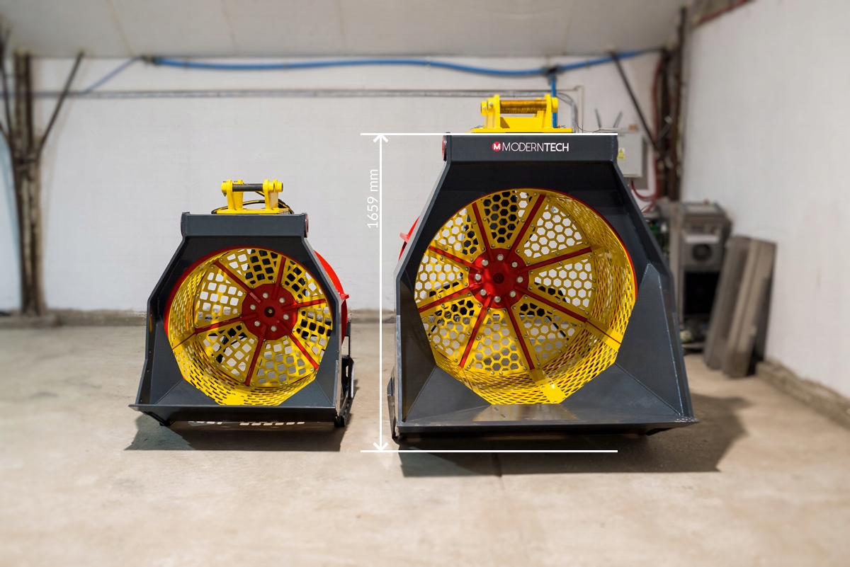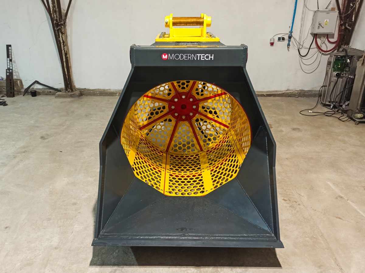 Міцна конструкція гарантує надійність і довговічність. Кошик ковша виготовлений зі змінних модульних панелей, які дозволяють швидко змінювати розмір грохота.