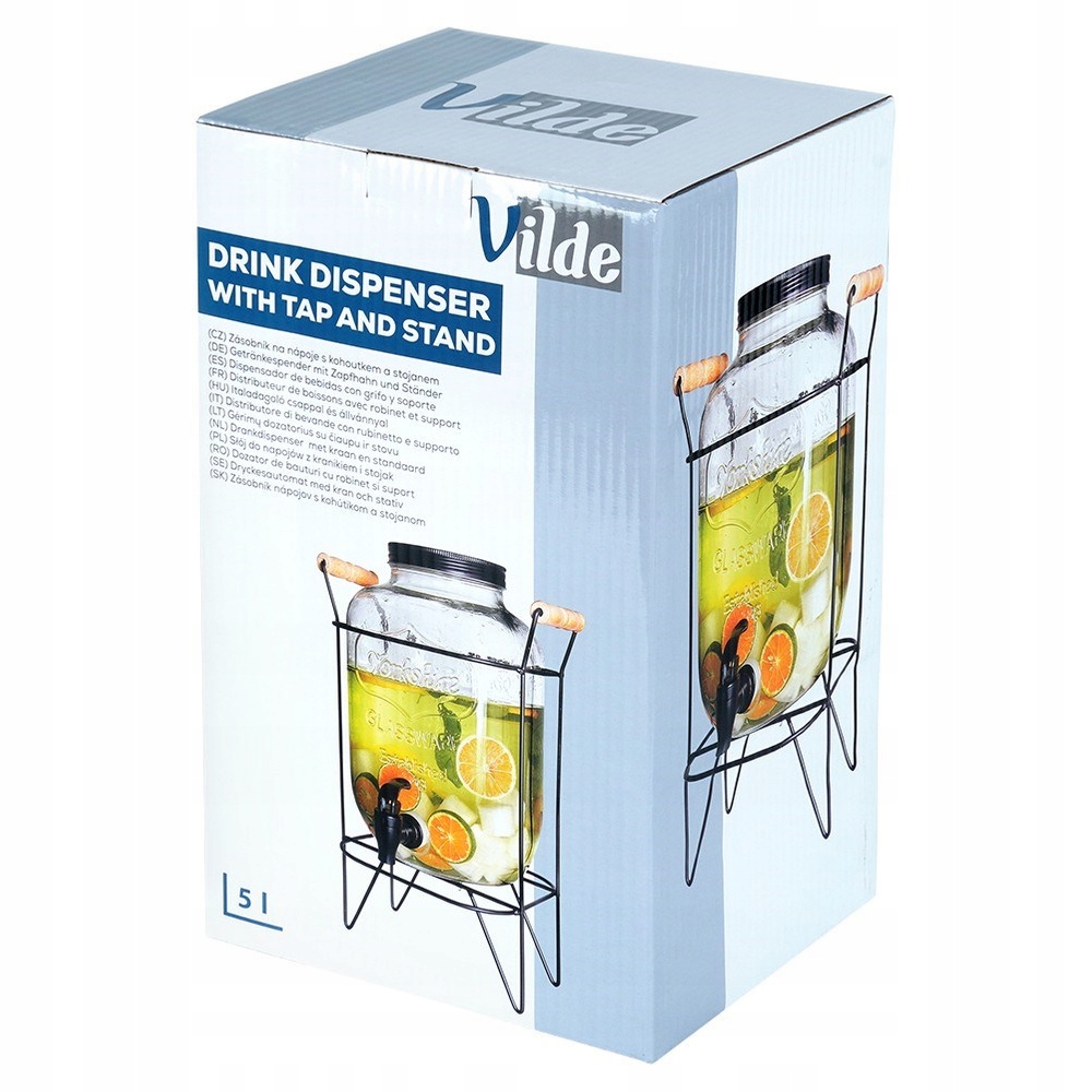 Набір складається з банки з краном і підставки під банку. Ідеально підходить для подачі води, лимонаду, соку, холодного чаю, ароматизованої води, а також пуншу. Завдяки крану ви можете легко подати улюблені напої в ефектному вигляді. Ми можемо використовувати банку з підставкою як в саду, так і під час сімейних посиденьок. Завдяки закритій кришці в наш напій не потраплять комахи. Виготовлена з безпечних для здоров'я та харчових продуктів матеріалів. Не підходить для гарячих напоїв. Увага! Упаковка містить невірну інформацію щодо ємності, фактична ємність відповідає наведеному вище опису. Оригінальна продукція Vilde. Виготовлена відповідно до європейських стандартів.