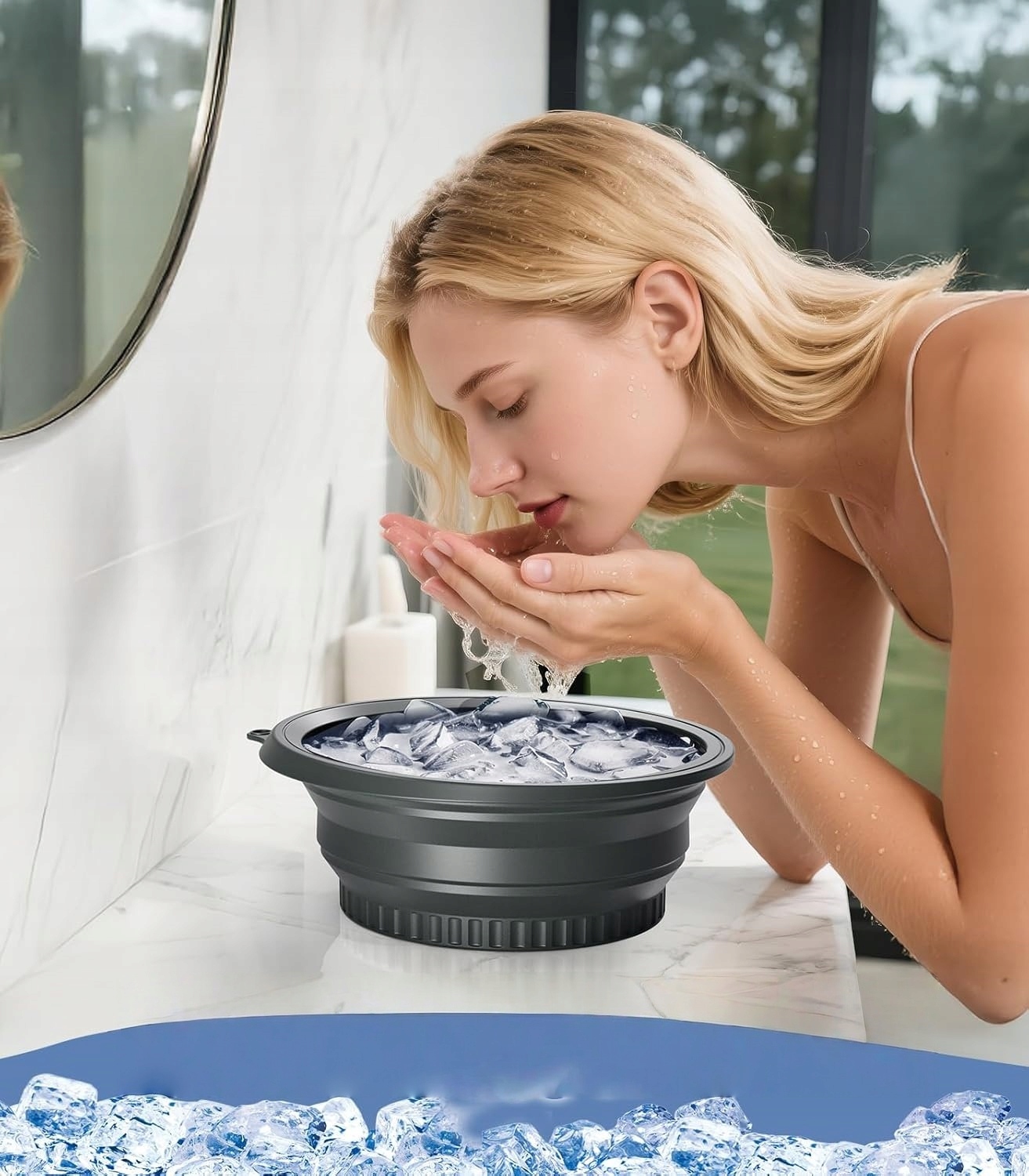 Терапія льодом для повного обличчя: вбудована форма для льоду швидко охолоджує воду для освіжаючої ванни для обличчя. На відміну від традиційних роликів із льодом, ця силіконова чаша діє на все обличчя, зменшуючи набряклість, звужуючи пори, покращуючи кровообіг і заспокоюючи запалення.
