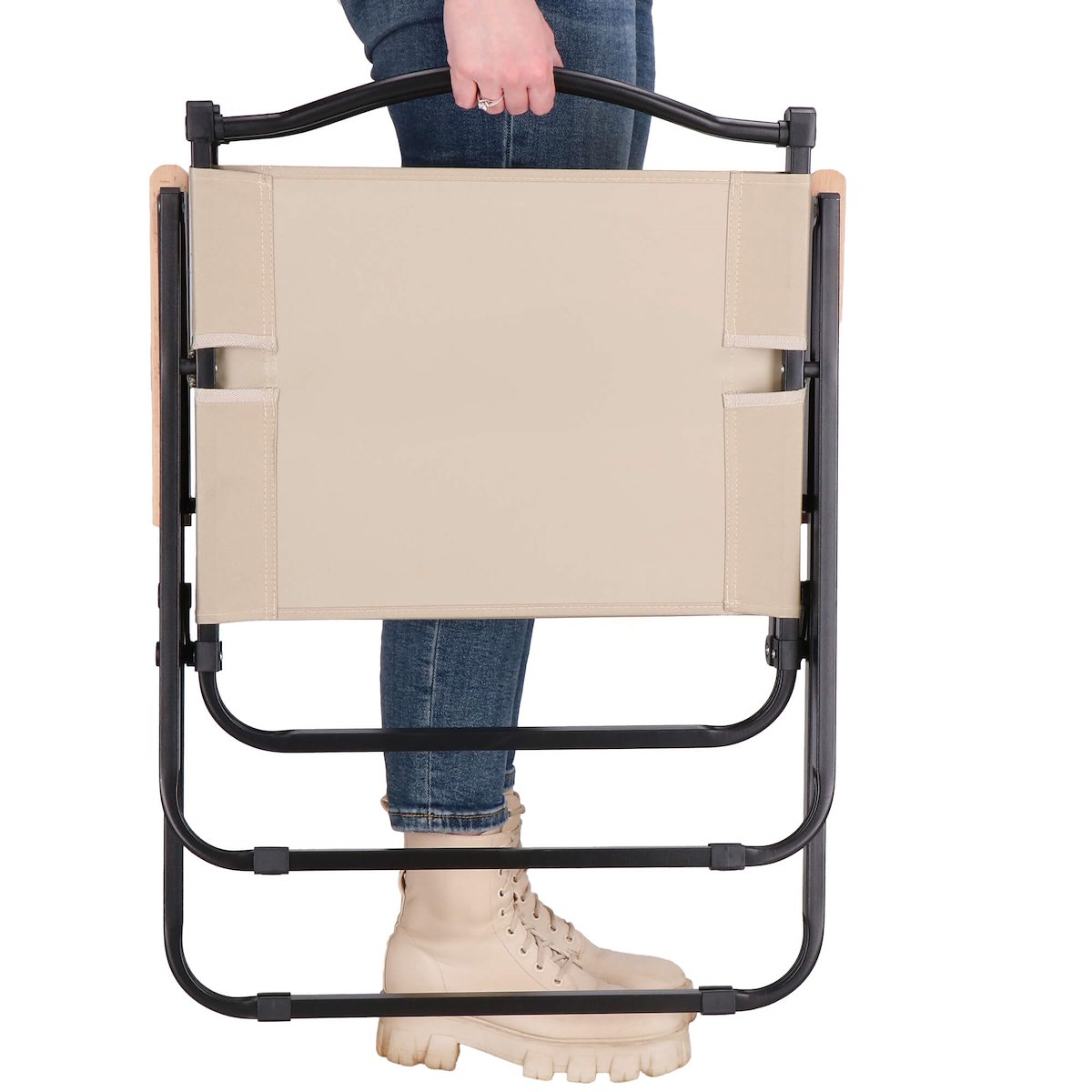 - Дугоподібні елементи спинки та сидіння забезпечують зручні ручки, які полегшують переносити та розкладати складене крісло