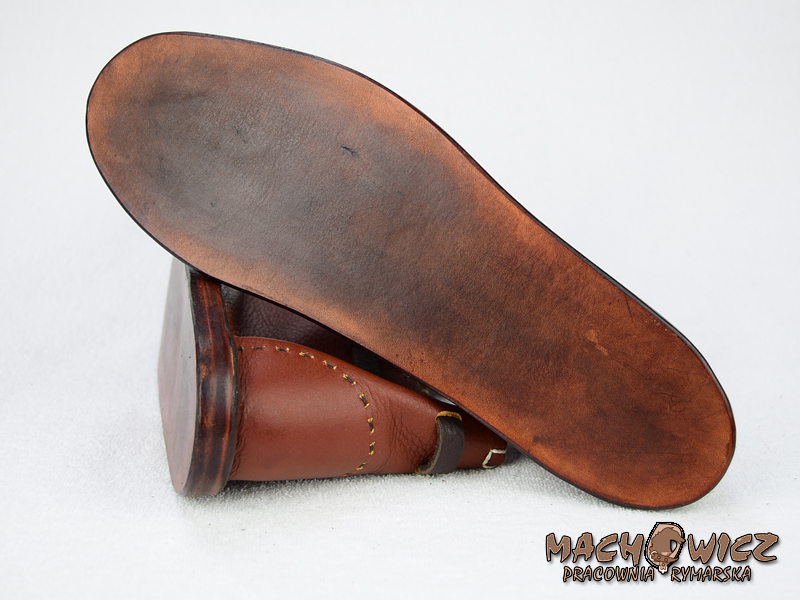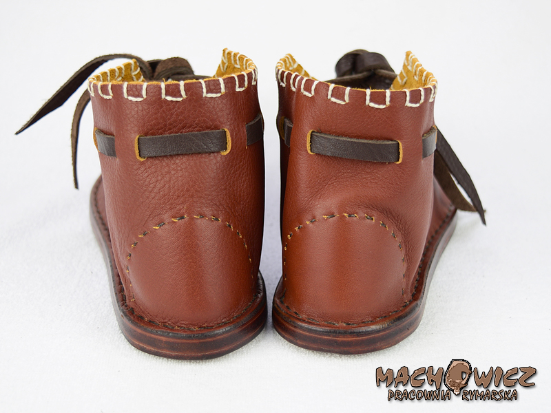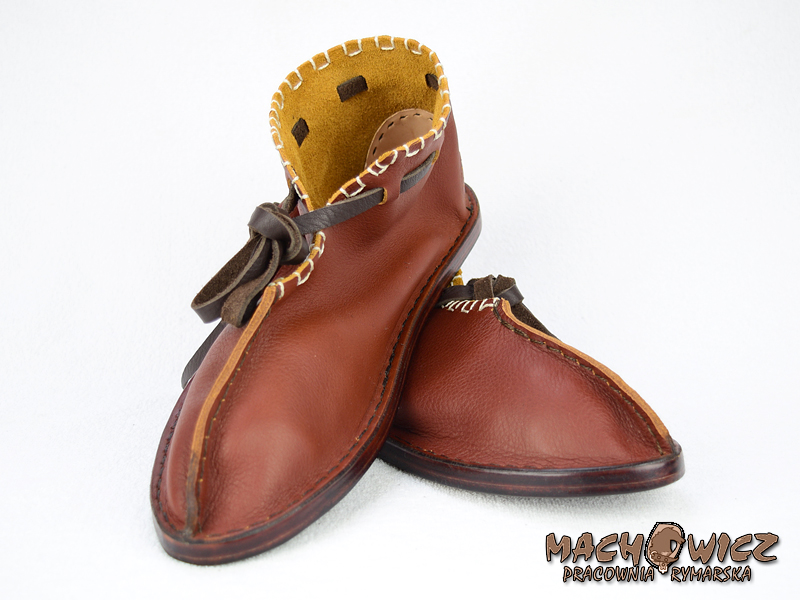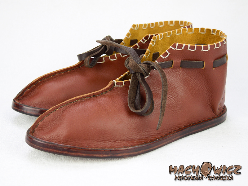 Взуття виготовлене за скандинавськими знахідками. Виготовлений зі шкіри бука, підкладка з рослинного жиру, товщиною приблизно 2,5 мм. Підошва з товстої задньої шкіри, приблизно 5 мм. Взуття зшито вручну вощеним шпагатом і глухим швом, щоб уникнути стирання шва. Підошва взуття просякнута бджолиним воском.