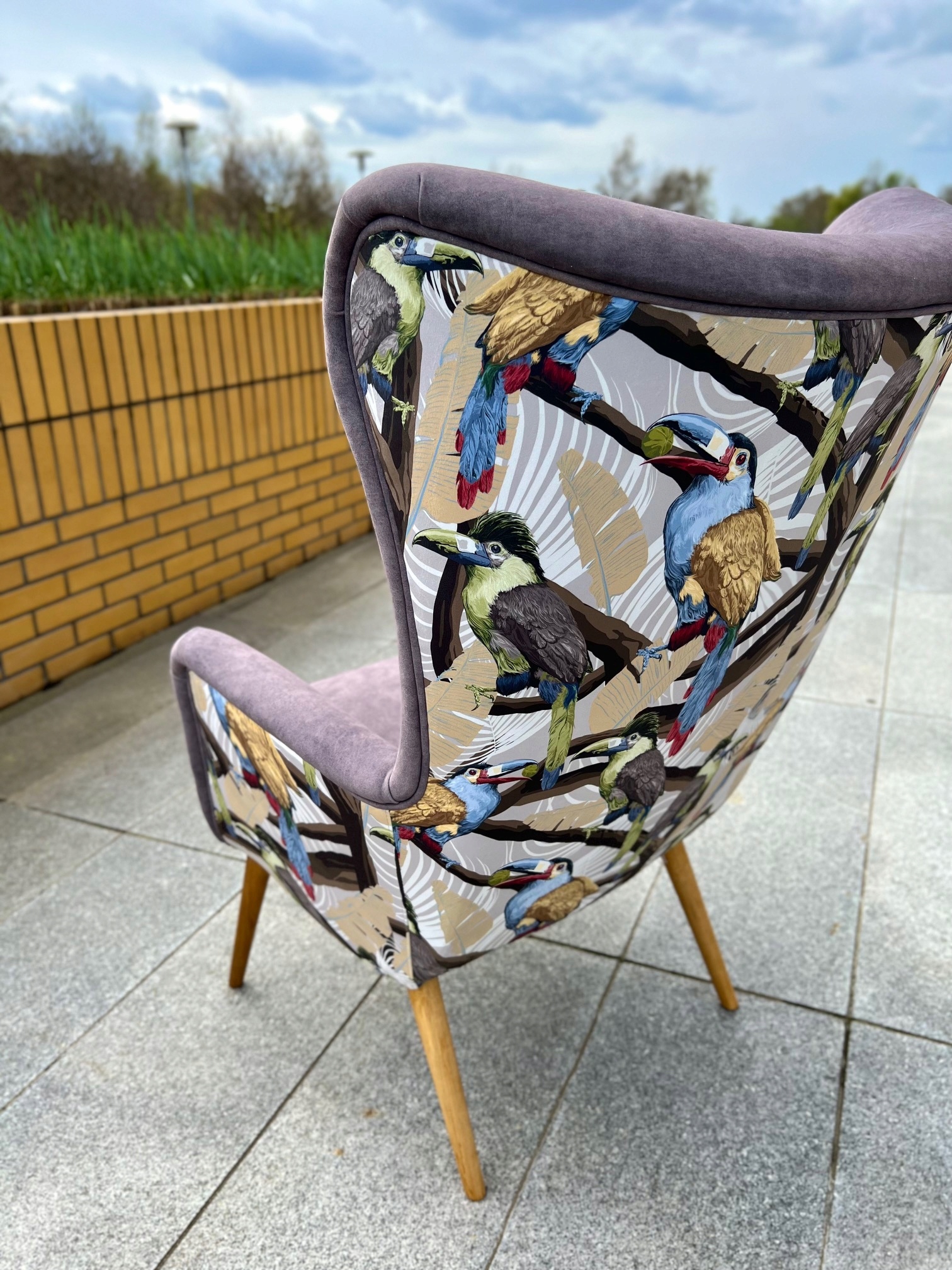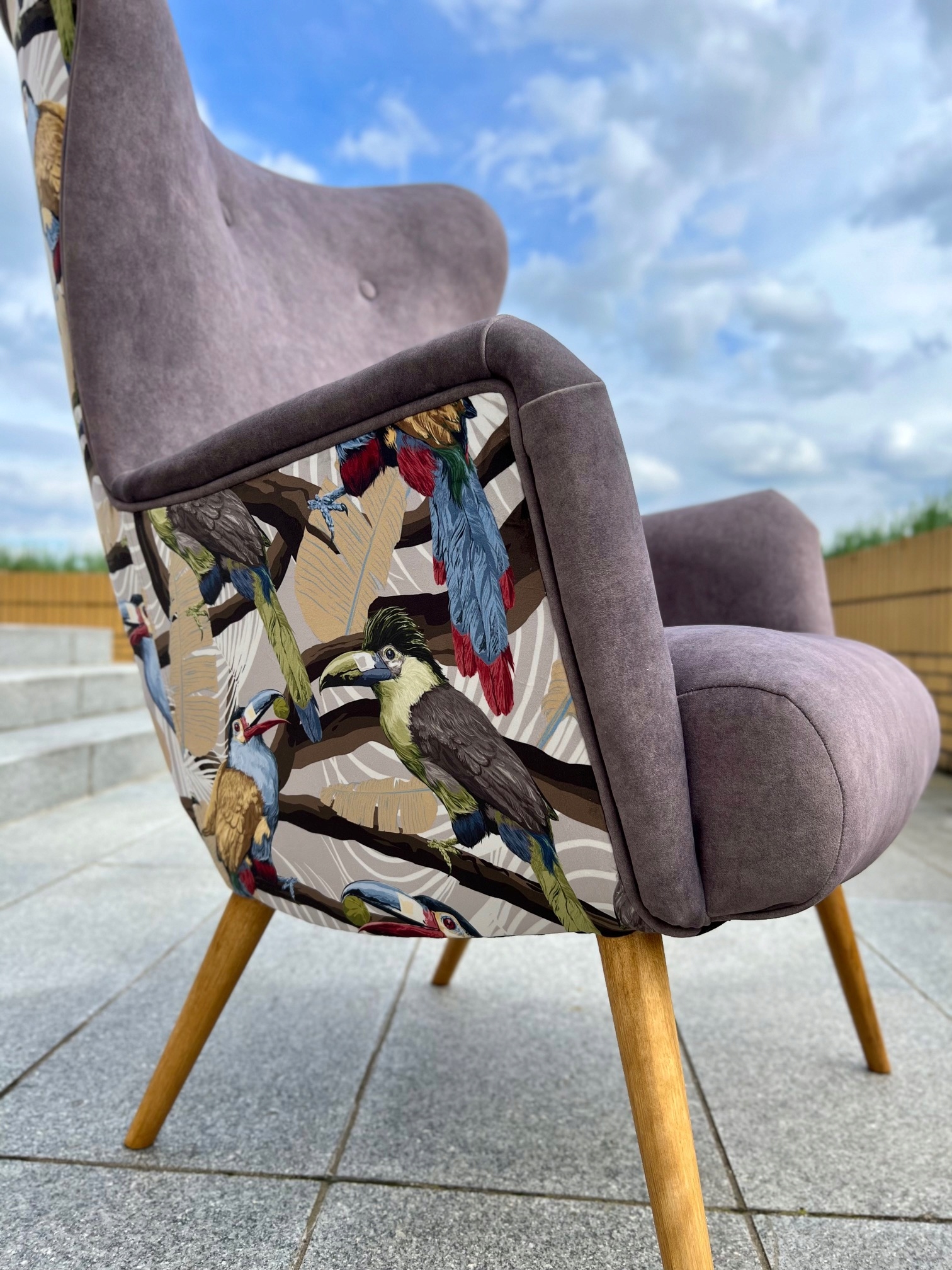 Спинка та бічні сторони крісла виготовлені з оксамиту з принтом екзотики. птахів на чорному тлі. На сидінні та спинці використовується пляшковий зелений оксамит хорошої якості. Матеріал міцний, приємний на дотик і має функцію легкого чищення. Окантовка навколо крісла цегляного кольору, а кнопки під колір сидіння та спинки. Деревина (ніжки) пофарбована в чорний колір. До комплекту можна зробити підставку для ніг.