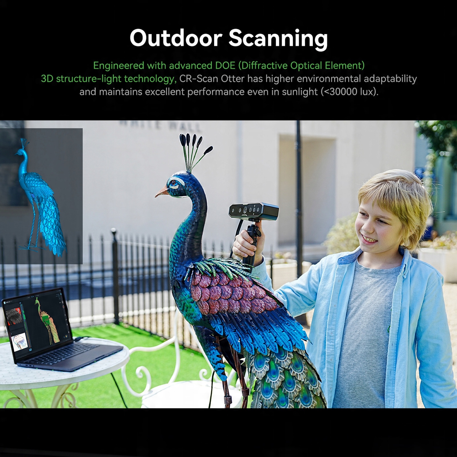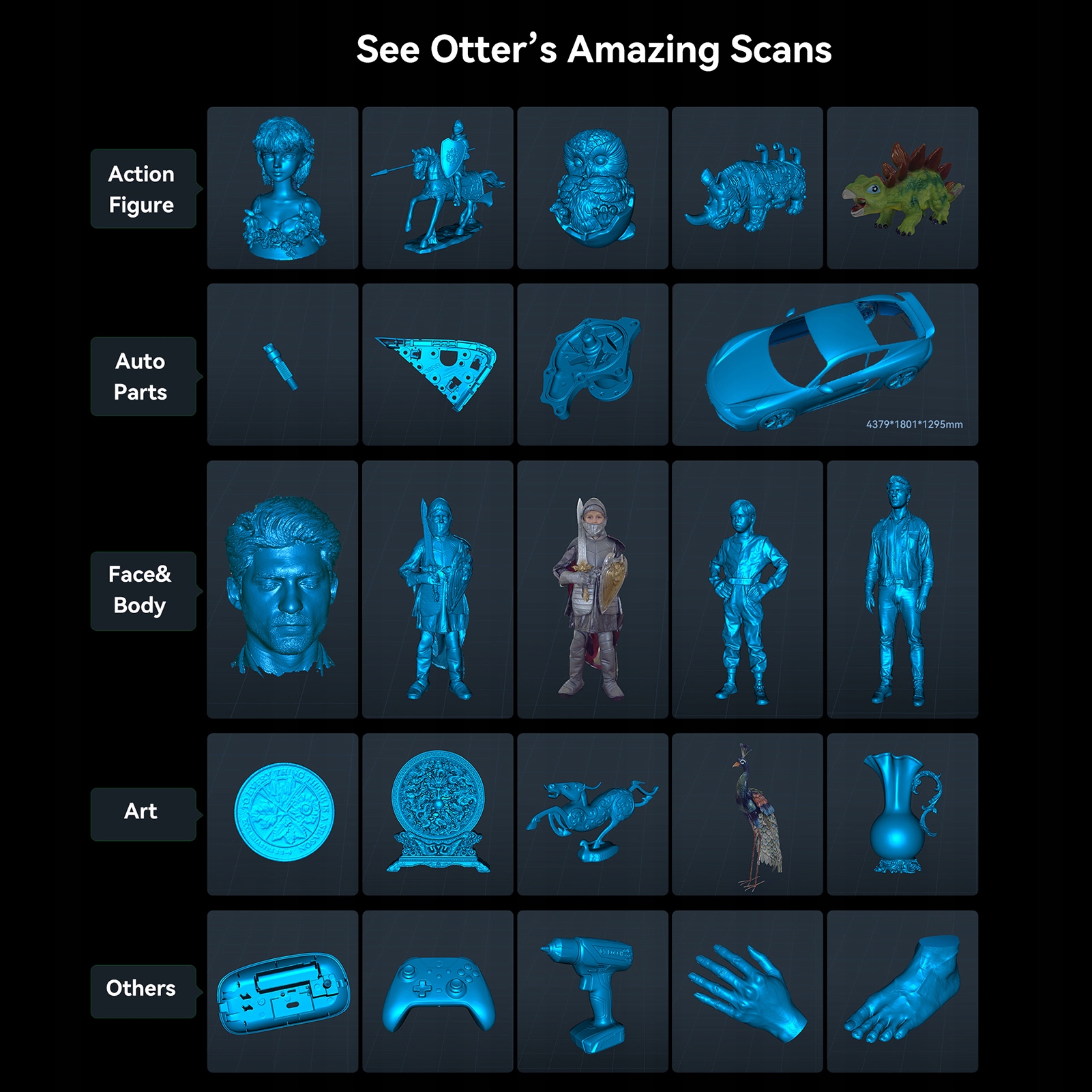 Висока продуктивність і швидке 3D-сканування: 3D-сканер Otter забезпечує передову функціональність 0,02 мм і високу швидкість сканування 20 кадрів на секунду. Завдяки такому рівню точності можна зафіксувати навіть деталі об’єкта, що дає змогу швидко й легко створювати високоточні 3D-моделі.