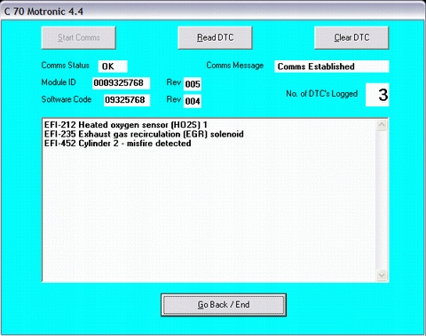 Коли ми вибираємо модуль, який нас цікавить, ми включаємо запалювання та чекаємо встановлення з’єднання з контролером. На малюнку показано приклад зчитування кодів з контролера двигуна в моделі C 70.