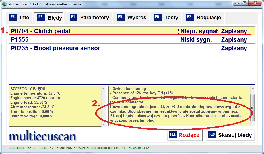 На наступному малюнку показана дія функції "помилки". Діагностований автомобіль-Alfa-Romeo 1.9 JTD 16V `04R. Малюнок представляє приклад коду помилки № P0704 (1) разом із поясненою причиною цієї несправності (2). Ці помилки можуть бути видалені в будь -який час, натиснувши функцію "Видалити помилки". Параметр "Параметри" показує значення вимірювальних блоків під час руху. Нижче наведено приклад цієї функції під час тестового драйву на 17 км/год.
