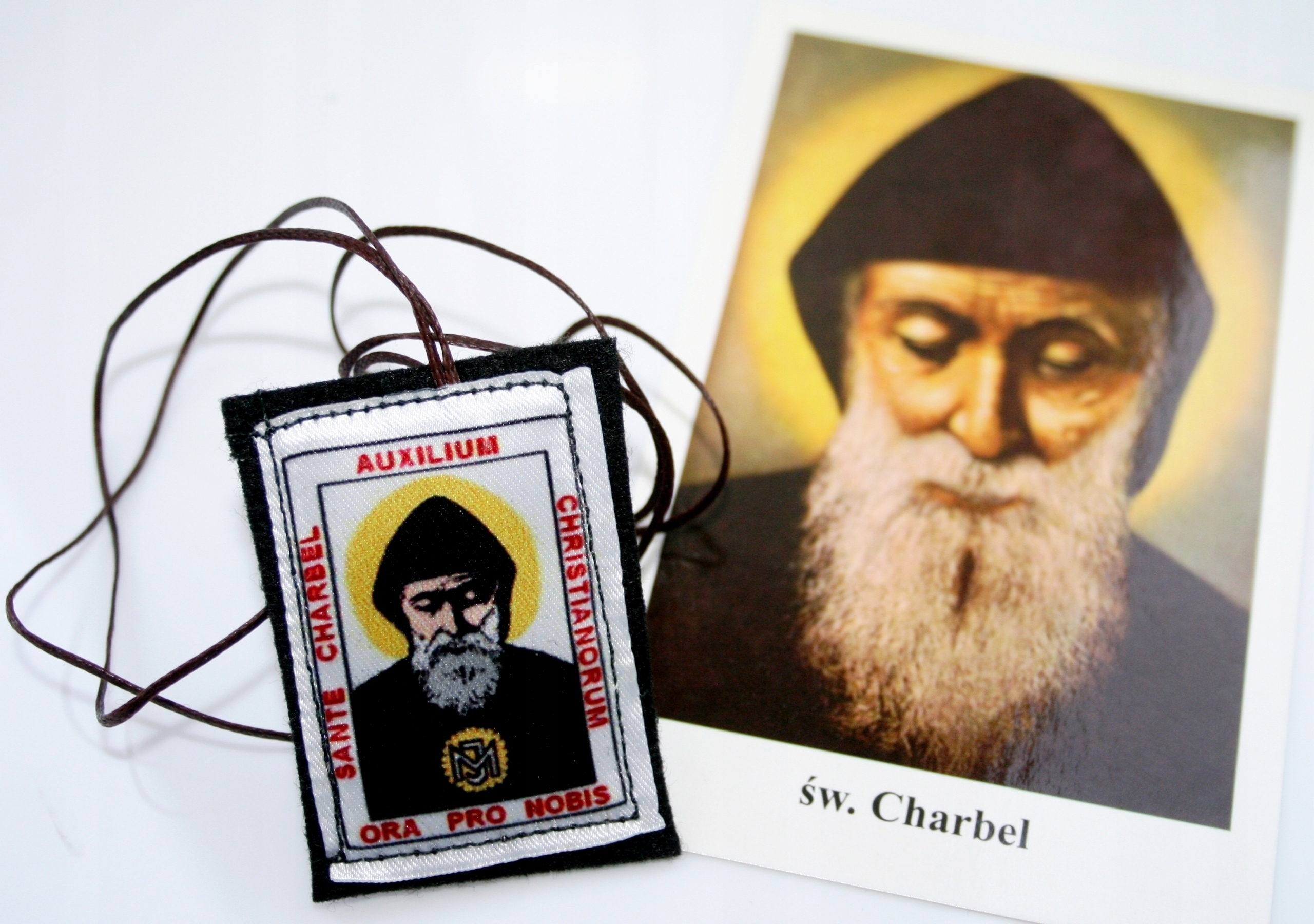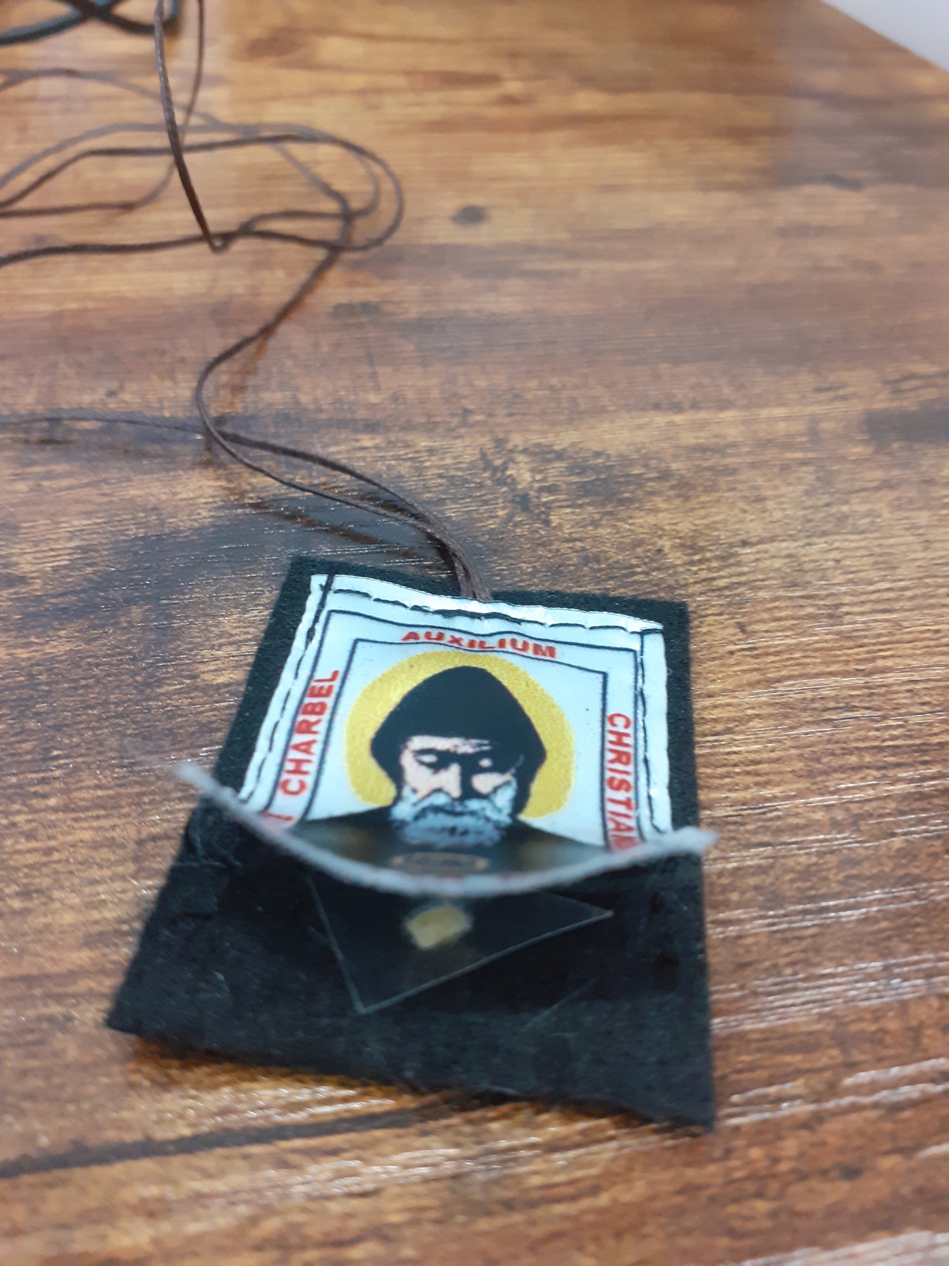 Скапулярій св Шарбель з вшитою всередину олією св. Шарбеля (між полотном і тканиною із зображенням св. Шарбеля). Шарбель (змочений ватний диск, обклеєний безбарвним скотчем)