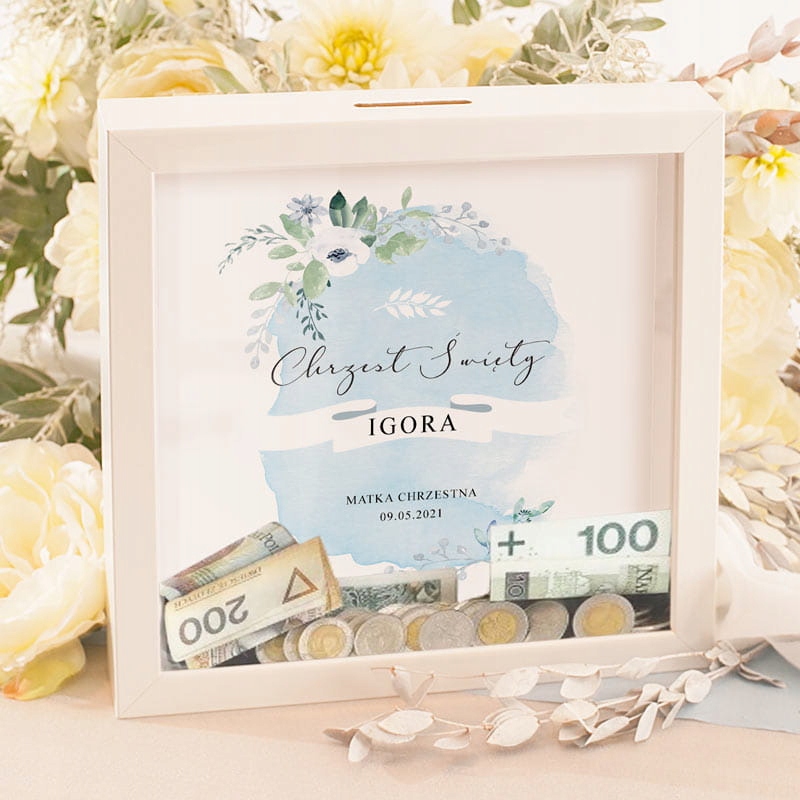 - Предмет Представлений нами походить з колекції Blue Twigs і має форму квадратної скляної рами. Його фоном є синя етикетка, прикрашена аквареллю квітів і написом «Святе Хрещення». У центральній частині є біла стрічка, на якій ми можемо поставити ім'я хрещеної дитини