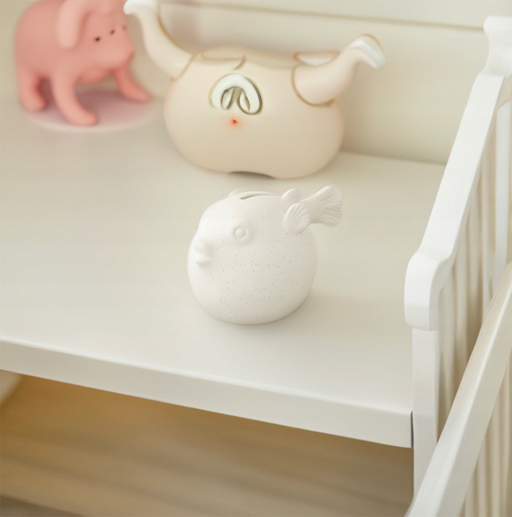 - Форма риби-фугу надає скарбничці унікальний характер. Білий колір надає їй чистоти та свіжості, чудово поєднуючись з різними інтер'єрами та стилями оформлення.