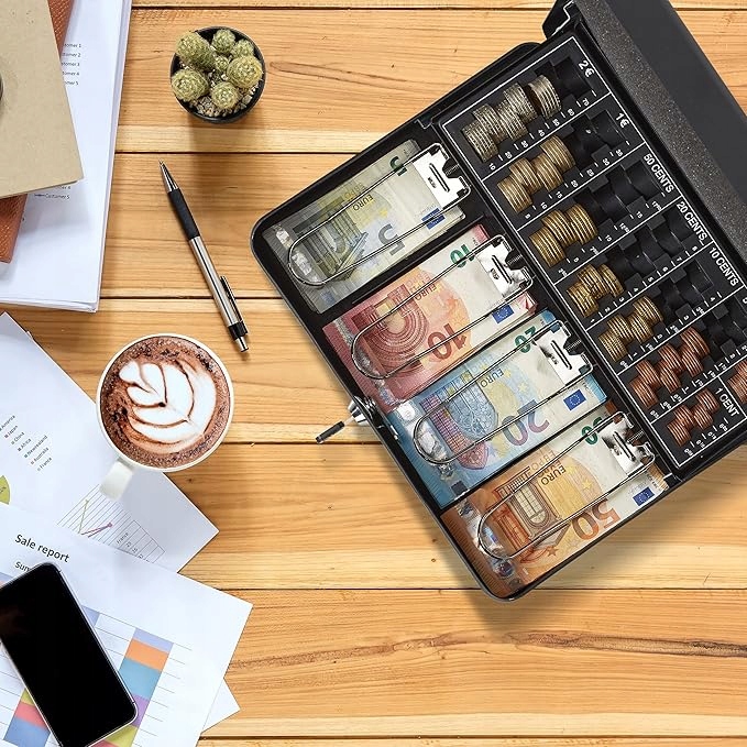 4 відділення для банкнот із затискачами та панеллю для підрахунку монет — швидке сортування та повний контроль над готівкою.