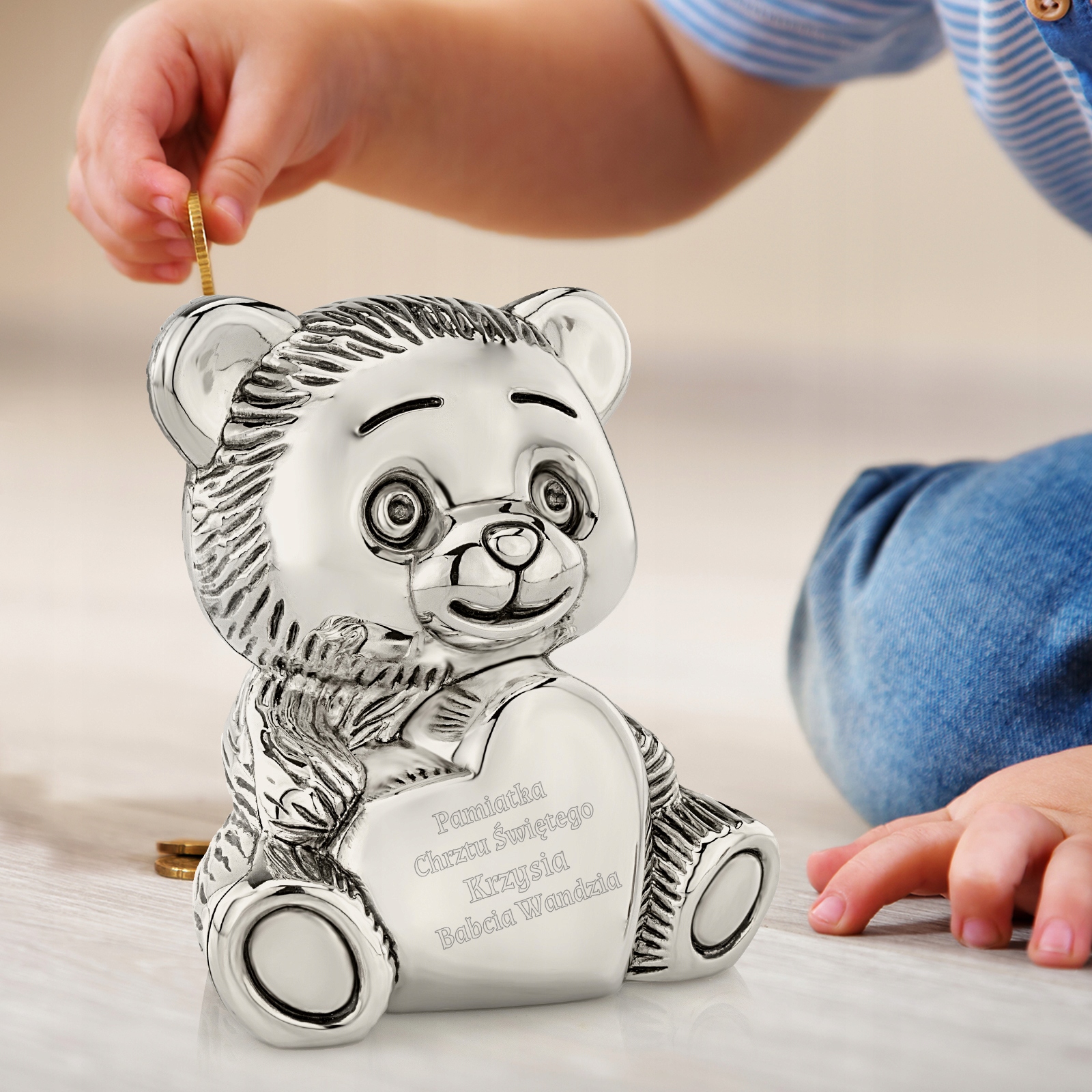Скарбничка у формі симпатичного ведмедика — чудовий подарунок на багато випадків. Надзвичайно привабливий зовнішній вигляд скарбнички робить її надзвичайно привабливою для найменших! Неодмінно підійде як сувенір до особливих подій у житті дитини, наприклад, дня народження чи Святого Хрещення. Він виготовлений з високоякісного матеріалу, а вся деталь посріблена та покрита глянцевим лаком. Внизу є пробка для виймання грошей.
