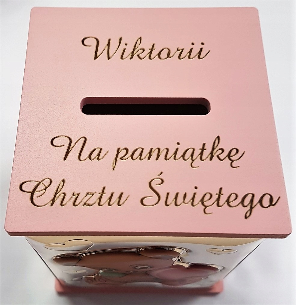 Скарбничка з різнокольорового дерева з емблемою навколо, посріблена за технологією PVD (Miro-Silver) та декораціями з кольорової фольги. Внизу є пластиковий ковпачок, який дозволяє вийняти вміст.
