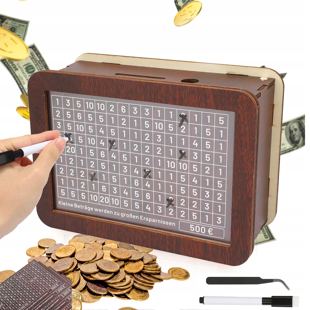 SKARBONKA WYKREŚLANA PREZENT WYZWANIE OSZCZĘDZANIE DREWNIANA+ MARKER