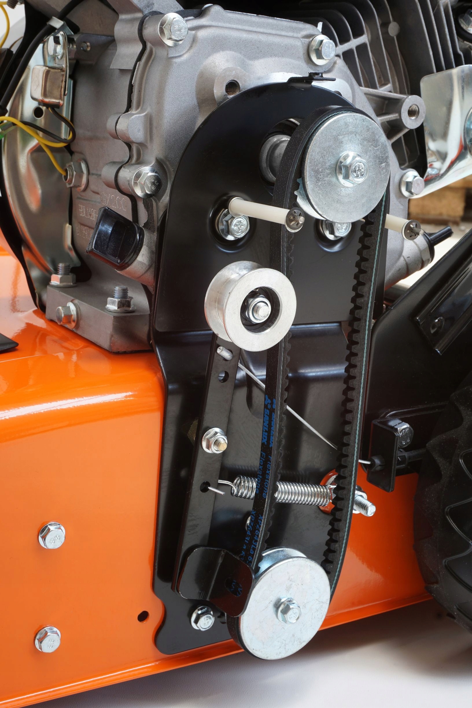 Система приводу робочого вала заснована на пасовій передачі з зубчастим пасом. Зубчастий ремінь набагато краще взаємодіє зі шківом. Він призначений для перенесення більш важких вантажів і високої швидкості обертання. Завдяки особливій структурі він більш стійкий до стирання та подовження, а зубчаста частина додатково підвищує міцність та несучу здатність ременя.
