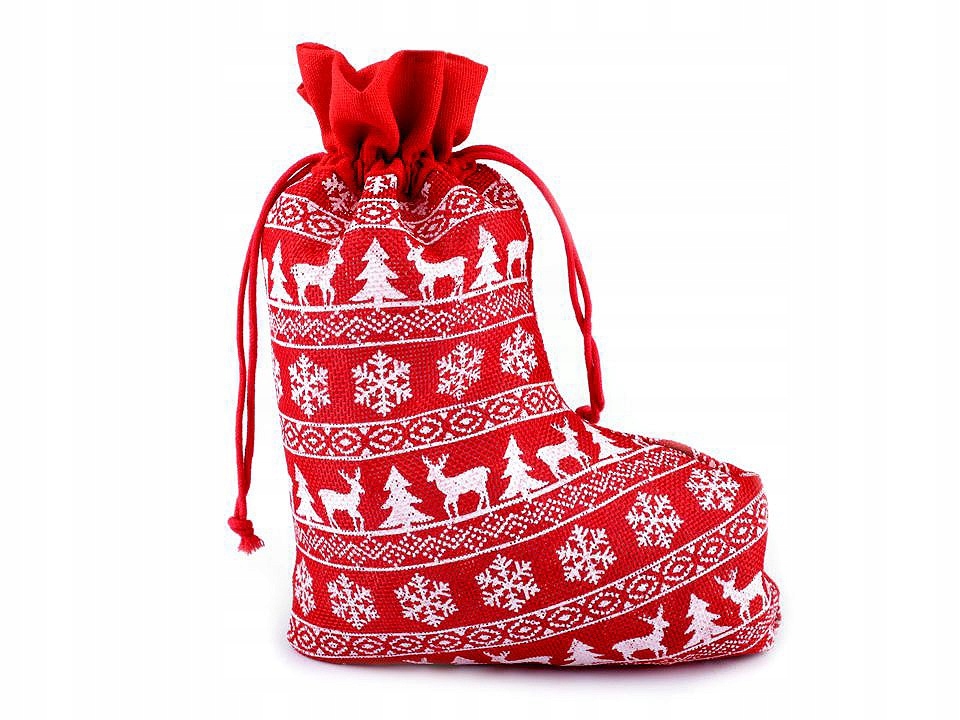 Черевик Діда Мороза середнього розміру, трохи менше формату А4. Виготовлені з цікавого матеріалу, який імітує джут і є більш міцним і стійким в порівнянні з дешевими фетровими шкарпетками. Прикрашена принтом з різдвяними мотивами. Закривається на шнурки. Туфелька чудово підходить для пакування солодощів для дітей, але вона також буде служити новорічною прикрасою.