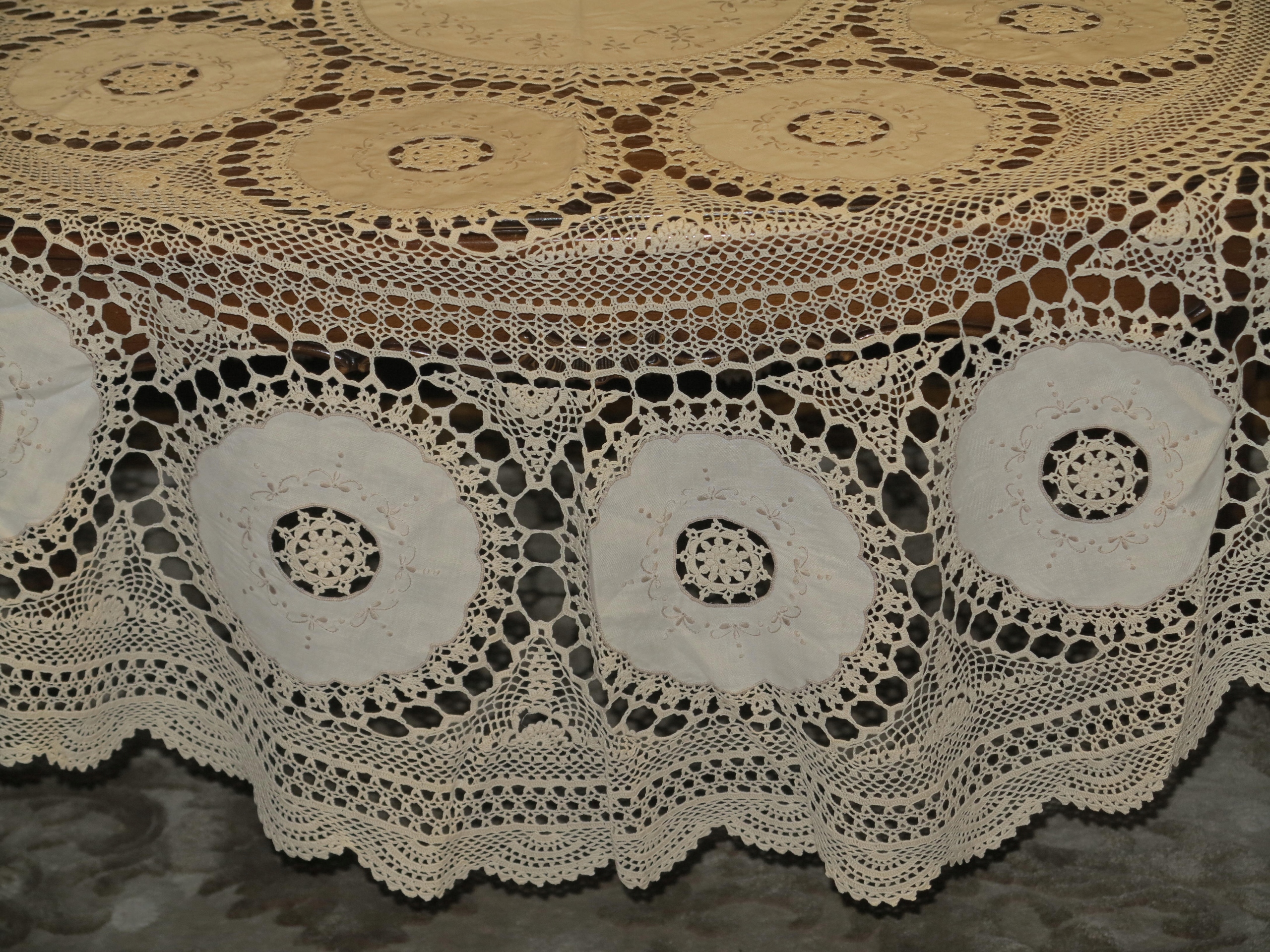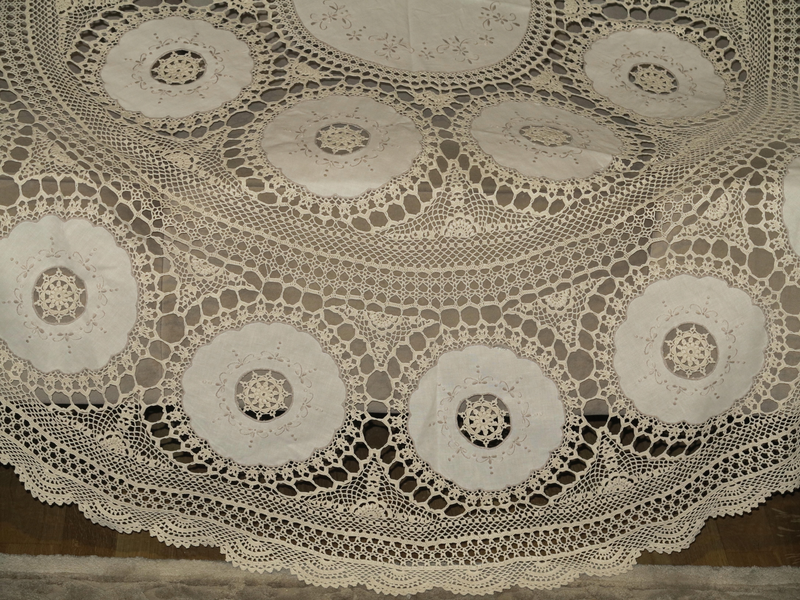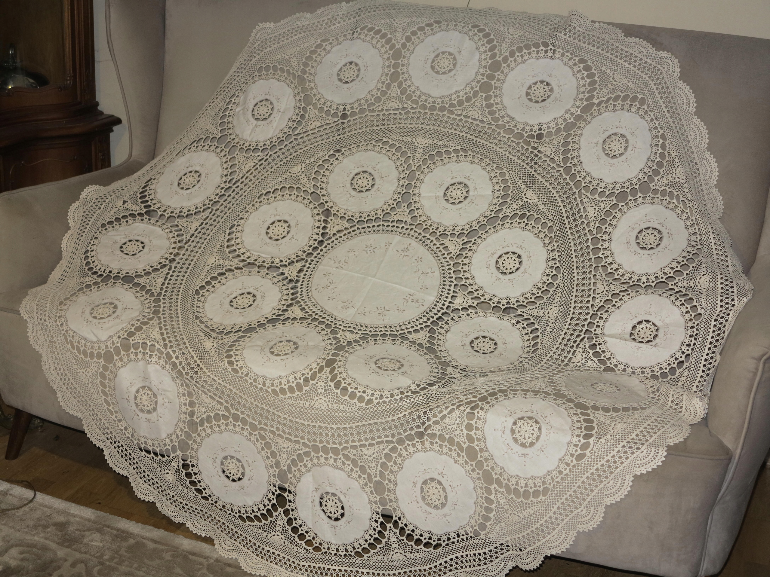 Предмет аукціону - скатертина надзвичайної краси, бежево-біла, виготовлена з кордонних ниток. , з вшитими лляними кільцями з вишивкою, дуже точна і складна робота. Його розміри: діаметр: 162 см. Скатертина б/у, в дуже хорошому стані. Рекомендую.