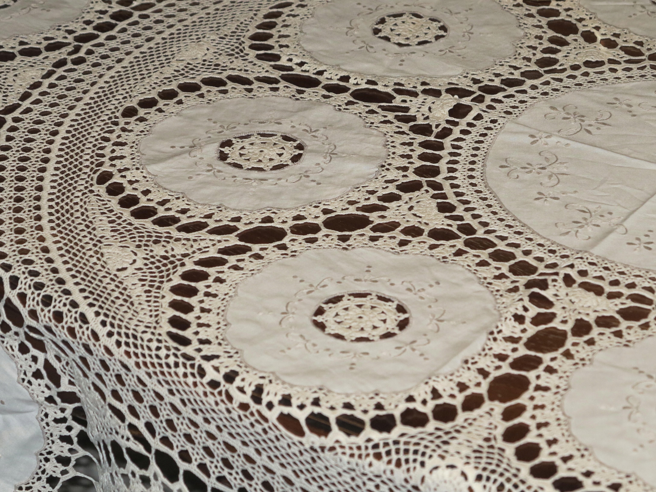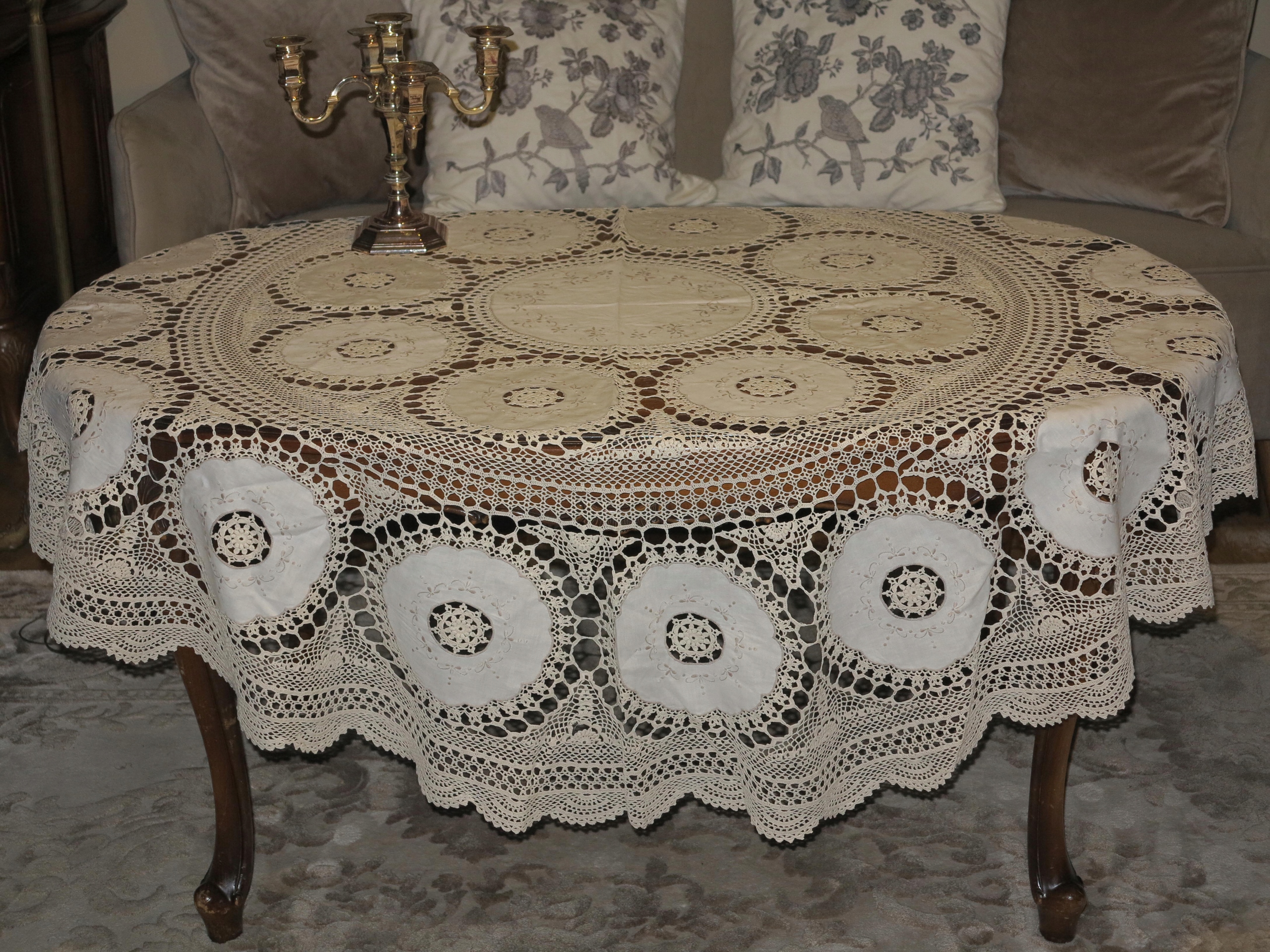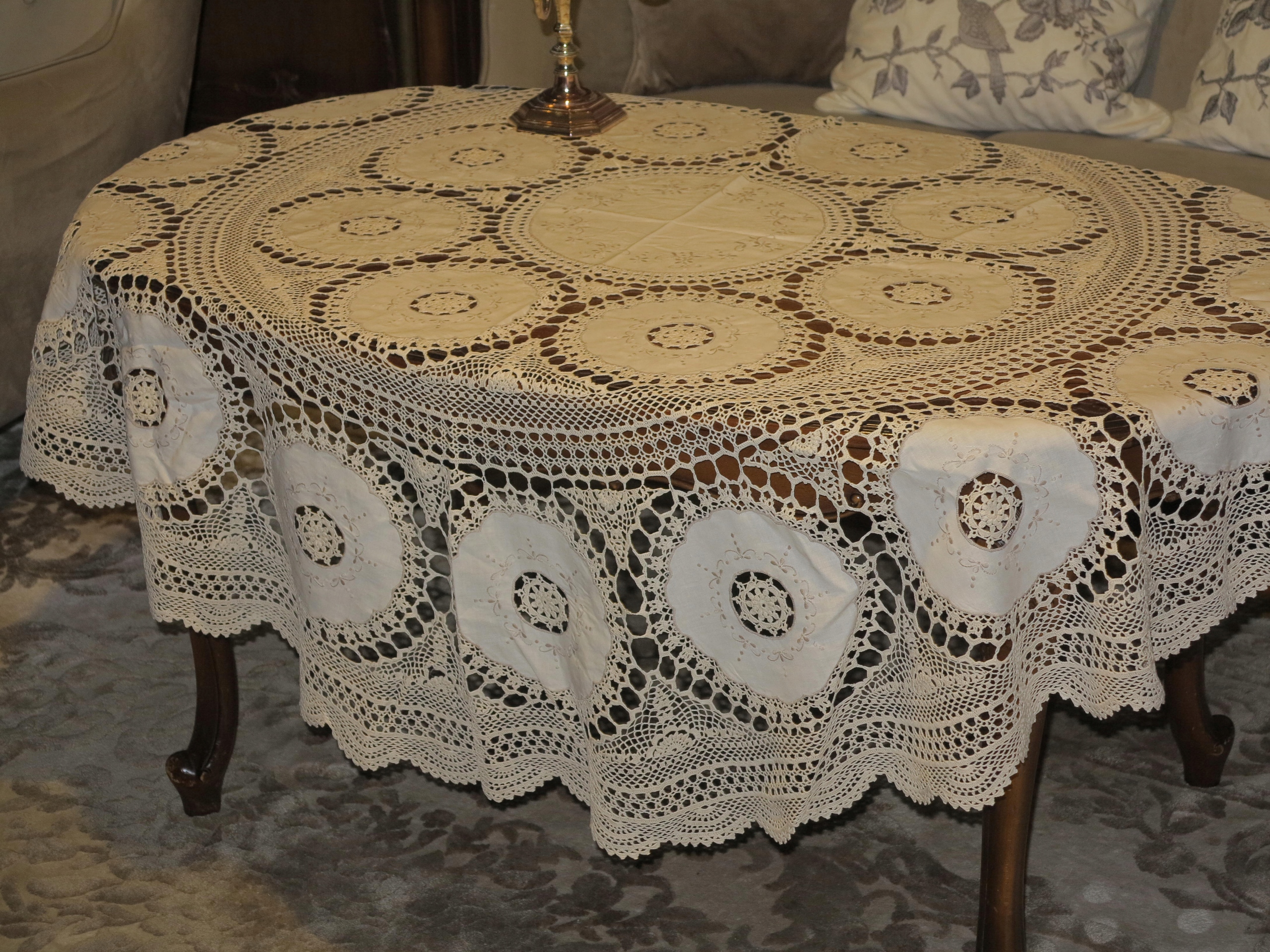 Предмет аукціону - скатертина надзвичайної краси, бежево-біла, виготовлена з кордонних ниток. , з вшитими лляними кільцями з вишивкою, дуже точна і складна робота. Його розміри: діаметр: 162 см. Скатертина б/у, в дуже хорошому стані. Рекомендую.