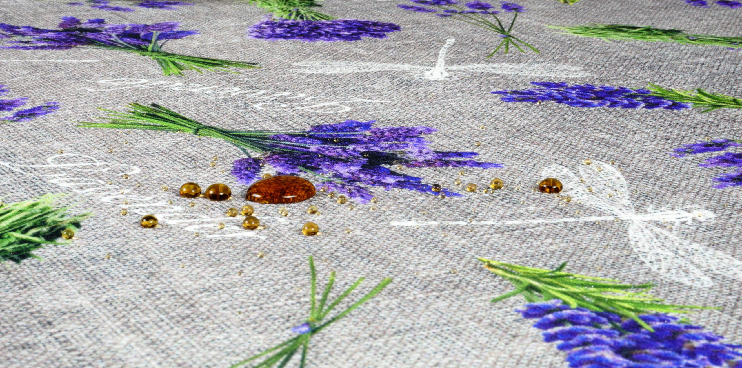На фоні, стилізованому під старе сіре полотно, розкидані букети. лаванди красивого фіолетового кольору з дзвінкими яскравими бабками. Скатертина в стилі старовинної Франції, чистий прованс.
