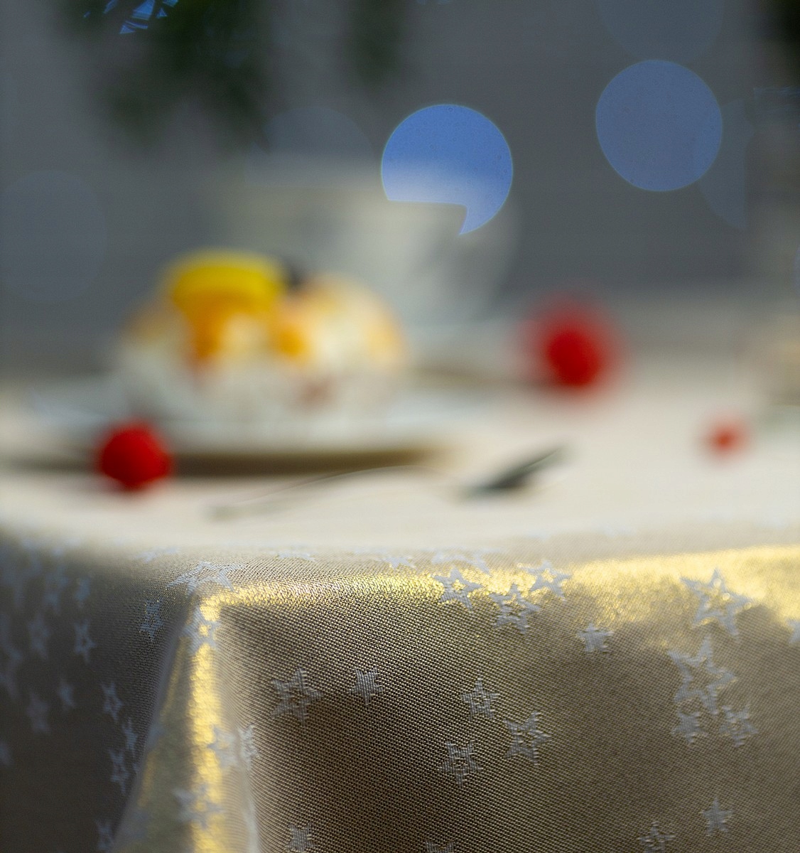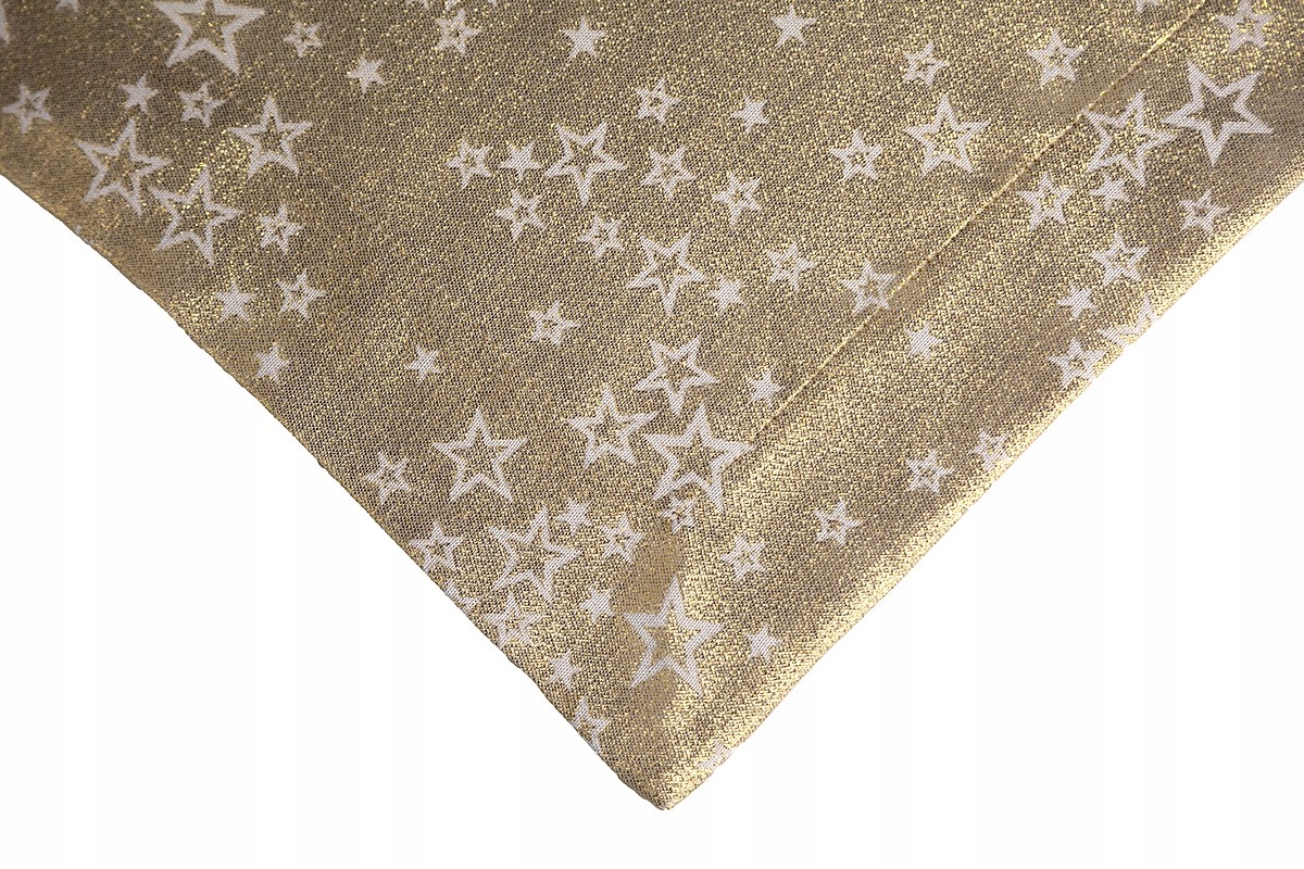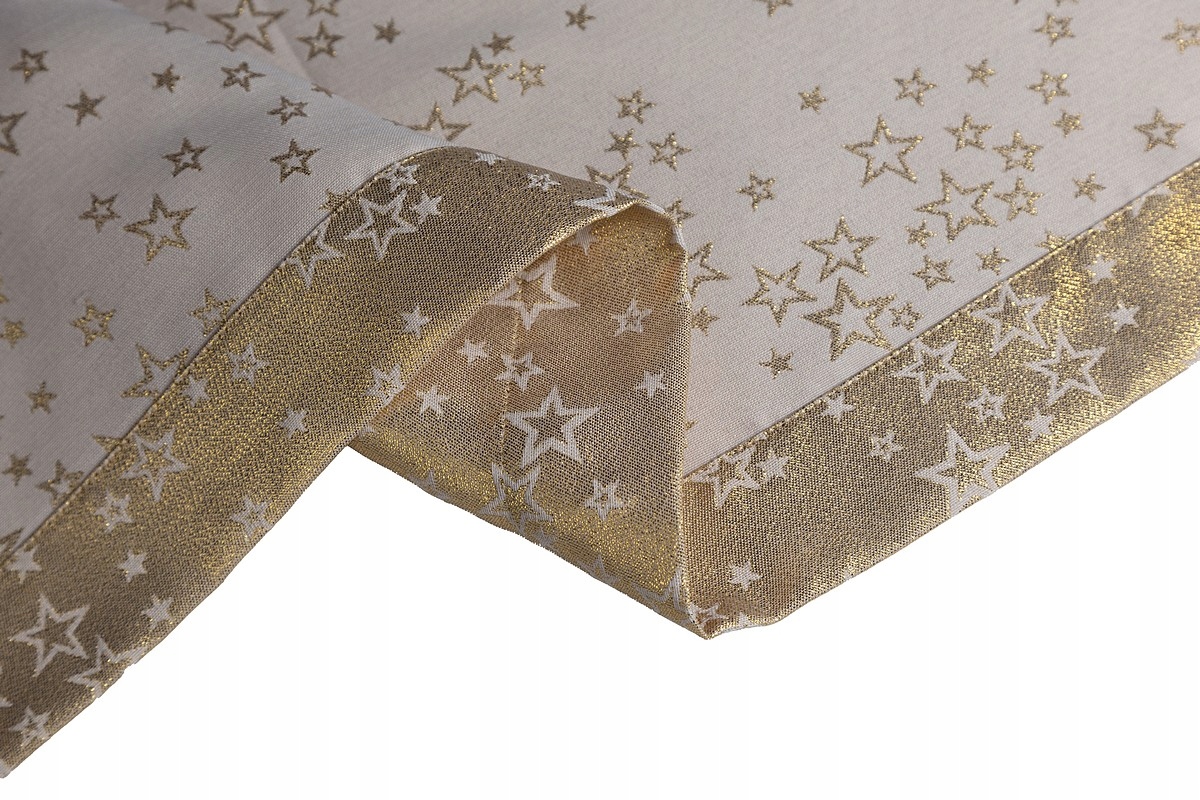 розкішну (преміум класу) жакардову скатертину із золотими різдвяними мотивами: красиві зірки на білому, злегка молочному тлі.