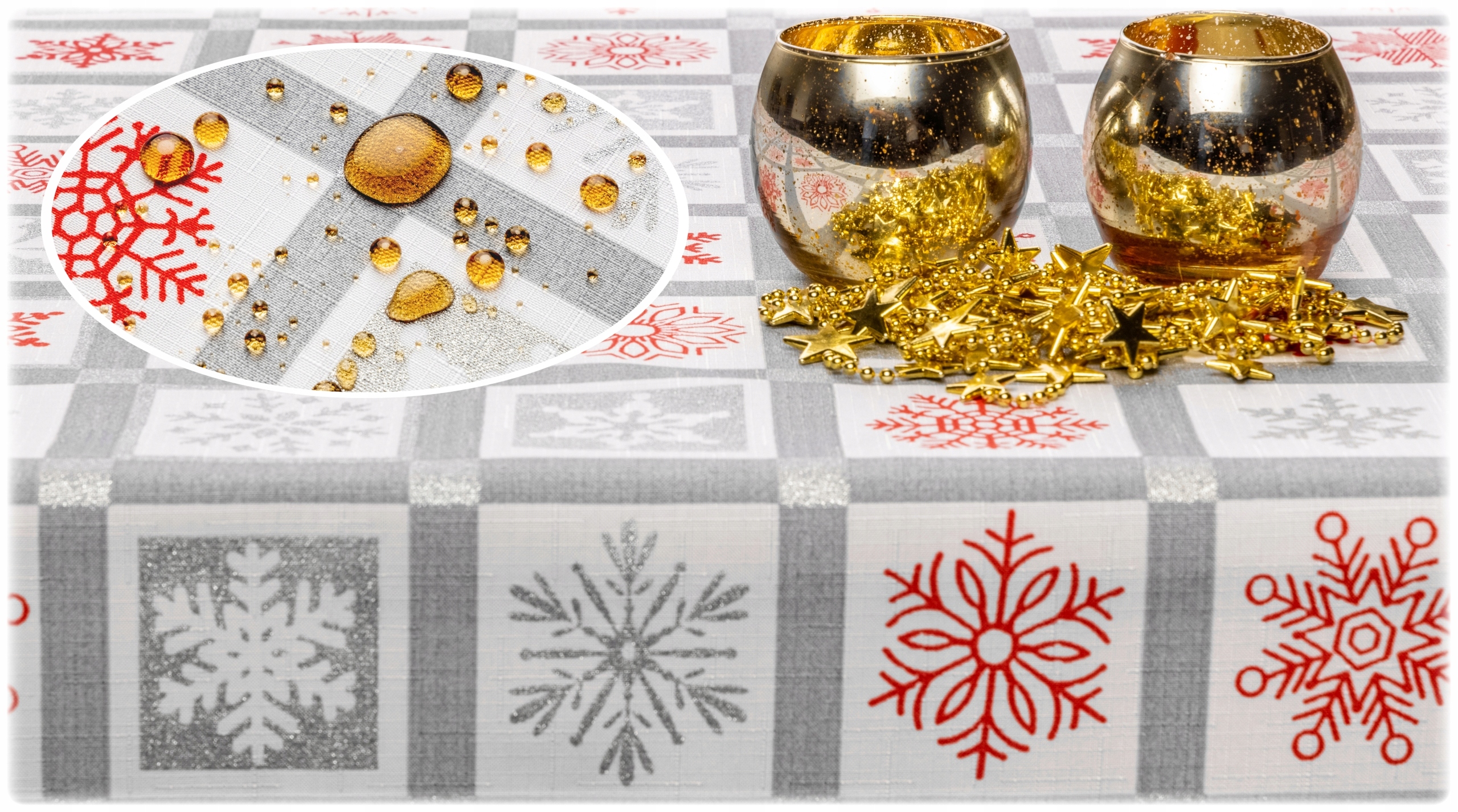 Скатертина має ПЛЯМЯСТІЙКЕ покриття (TEFLON FABRIC PROTECTOR), яке запобігає проникненню пролитої рідини в структуру скатертини.