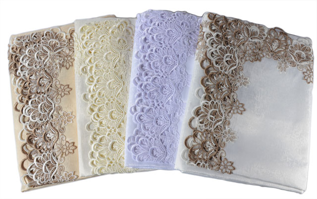 - Ми пропонуємо ці елегантні серветки в чотирьох кольорах: класичний білий, шампань, бежево-коричневий, молочний з бежево-коричневим гіпюром