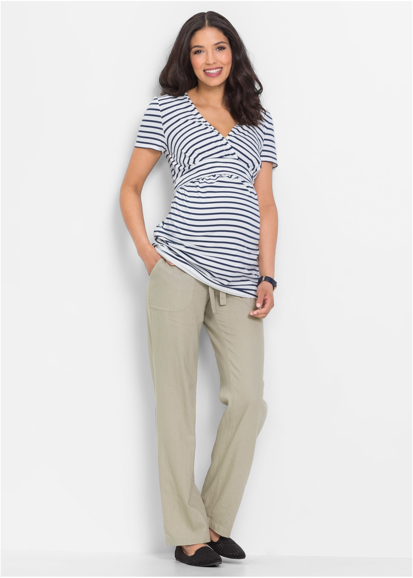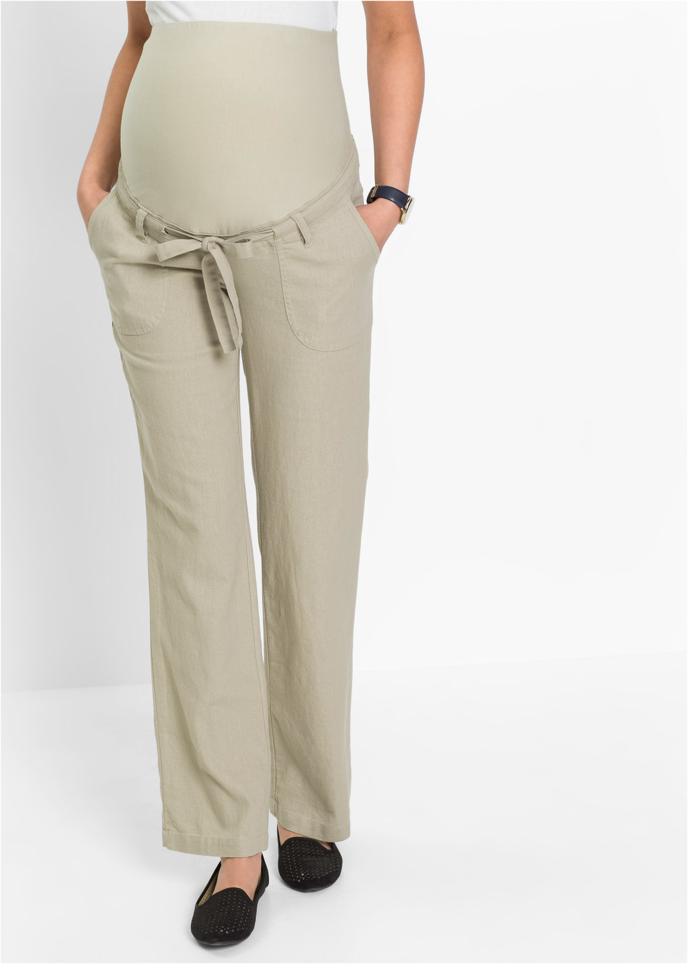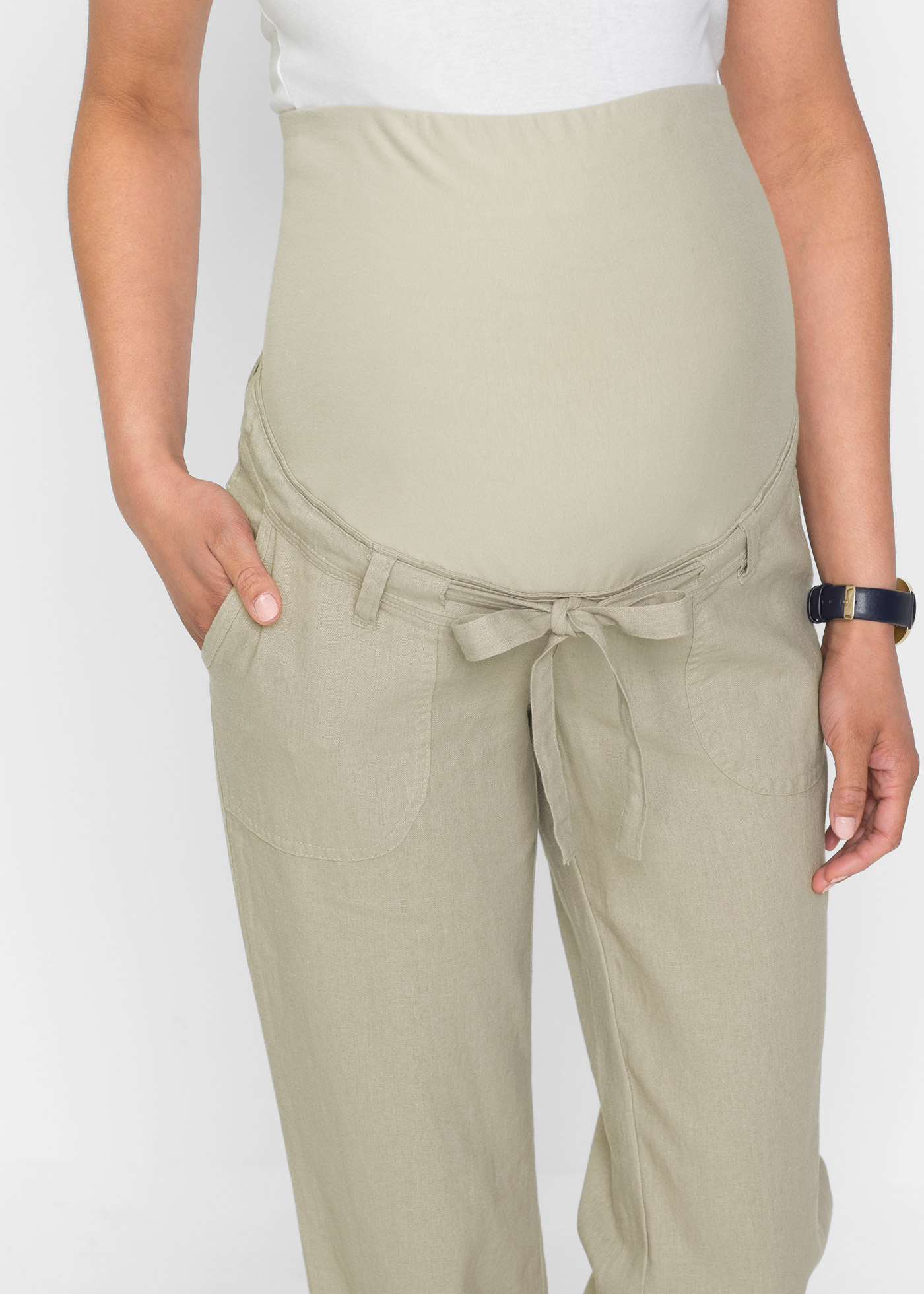 Чудові штани для жінок у вагітність. Штани відмінної якості з високоякісного матеріалу з перевагою льону. На талії є шлевки і тунель з поясом для самозав'язування. Дизайн із двома нашивними відкритими бічними кишенями та двома накладними задніми кишенями. Прямі, необлягаючі ноги зі складкою. На талії пояс/животна вставка з еластичної тонкої тканини, яка у верхній частині завершується регульованим по ширині тунелем. Створюйте унікальні стилі з цим фасоном штанів і виглядайте красиво, чекаючи на свою дитину.