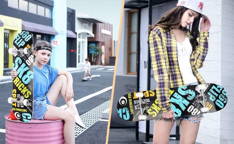 - 【Класний візерунок】Колір і графічний дизайн на дошці дуже креативний, що може задовольнити естетичні потреби всіх людей. Ви точно будете виділятися серед ваших друзів будь-якого віку. Нижня частина скейтборду має багато унікальних дизайнів, зокрема крутий, вишуканий, панк, новинка, ретро, класика тощо, завдяки яким ви станете найяскравішою фігурою в скейт-парку.
