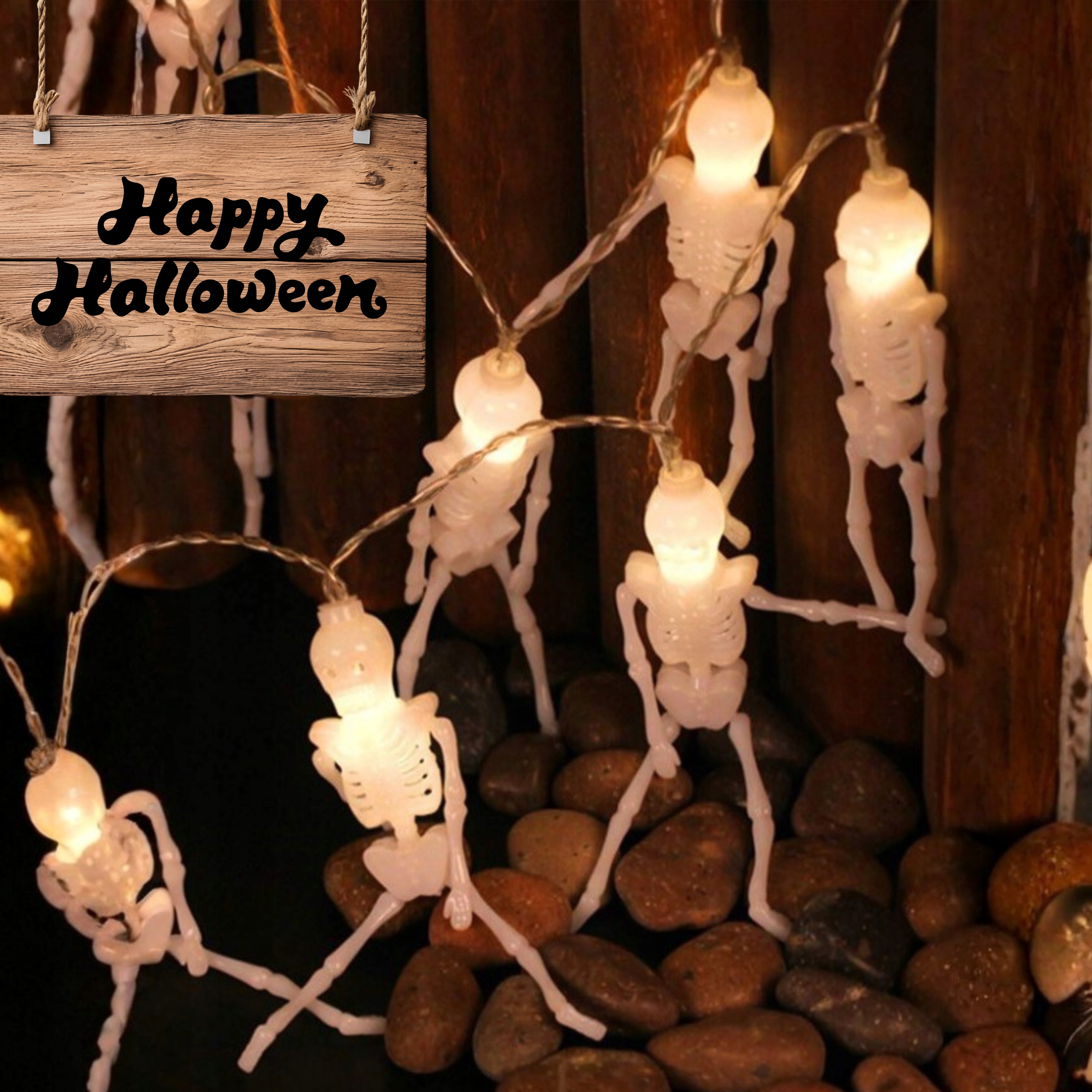 Гірлянда на Хеллоуїн у вигляді світяться скелетів - це спосіб додати неповторну атмосферу жаху в інтер'єр або сад. Десять світлодіодних ламп, розташованих на гнучкому кабелі, забезпечують потужне і тепле світло, яке створить неповторну атмосферу. Завдяки живленню від батарейок АА ви можете використовувати прикрасу де завгодно, без обмежень доступу до розетки. Вся річ виготовлена з міцного пластику, тому прикраса прослужить багато сезонів. Це ефектна прикраса, яка підкреслить неповторний характер вашого інтер’єру.