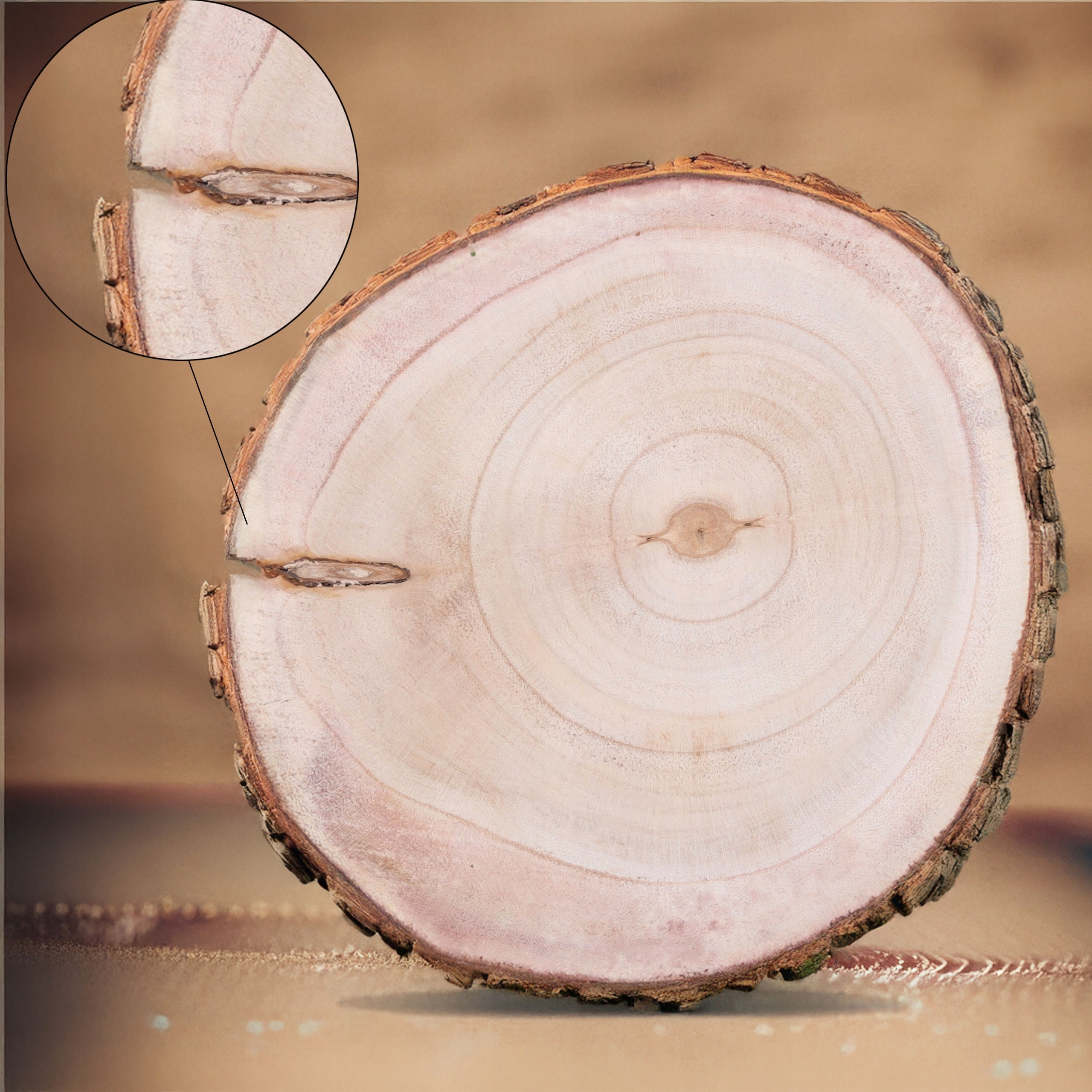 Зріз натурального дерева може мати прогалини в корі, які не впливають на його використання, а лише підкреслюють природний вигляд зрізу. Натуральний продукт, кожен відрізняється та може дещо відрізнятися за розміром.