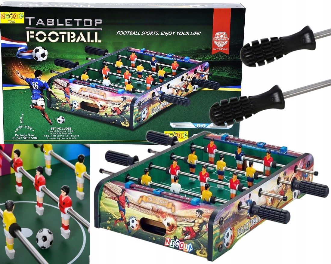 Мініатюрні гравці прикріплені до штанг із нержавіючої сталі, які обертаються на 360°, з м’якими ручками на кінцях, щоб забезпечити комфорт під час гри.< /h2 >Конструкція виготовлена з МДФ для забезпечення повної стабільності під час використання, оздоблена різнокольоровим візерунком для приємного вигляду.