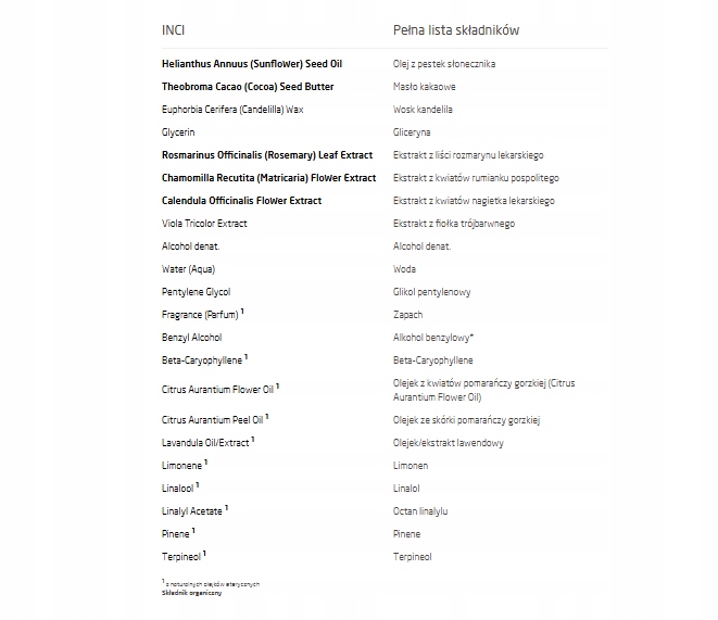 Склад INCI: олія насіння Helianthus Annuus (соняшникова), ланолін, віск бджолиний (Cera alba), гліцерин, екстракт фіалки триколірної, екстракт листя Rosmarinus Officinalis (розмарину), екстракт квітів ромашки ріжкої (Matricaria), екстракт квітів календули лікарської, Алкоголь, вода (аква), ароматизатор (парфум)*, лімонен*, ліналоол*, гераніол*