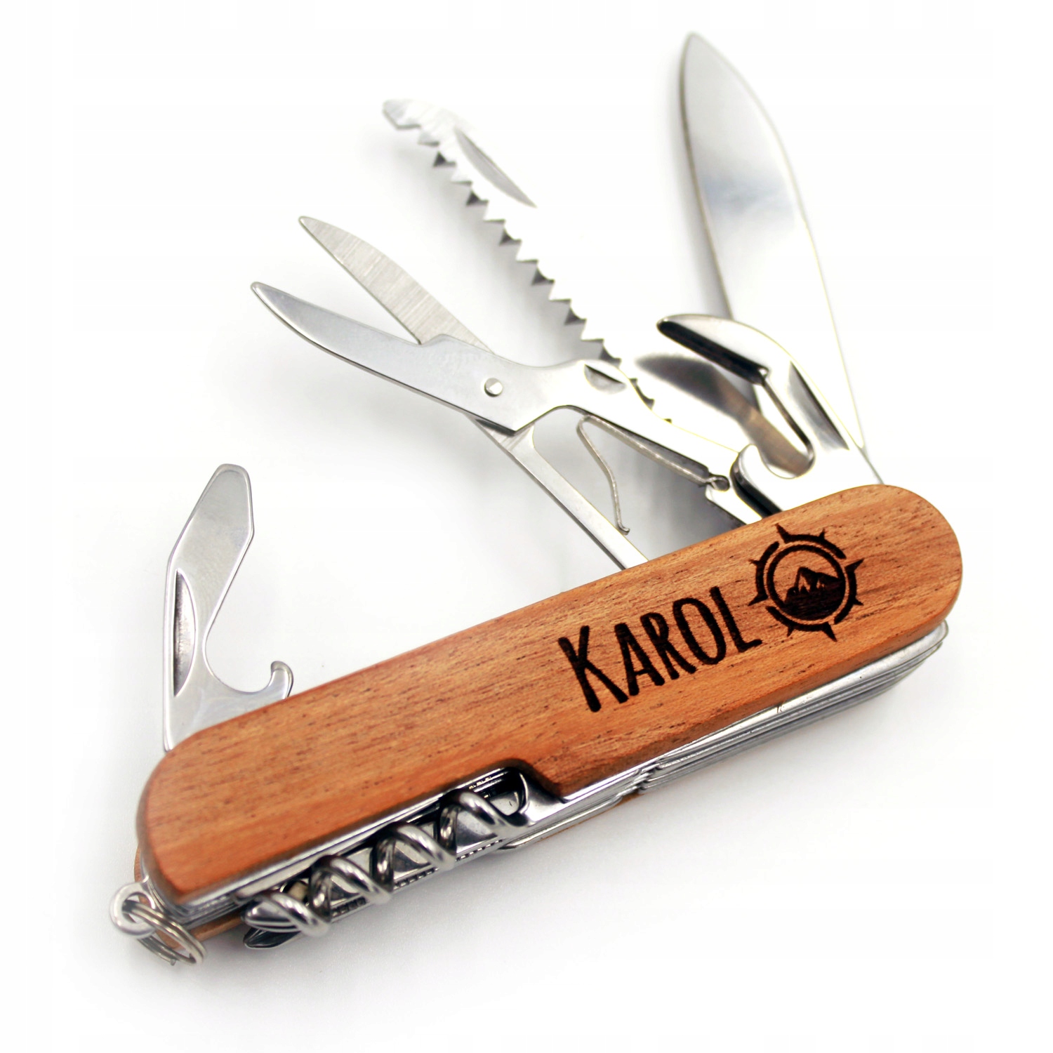КИШЕНЬКИЙ НІЖ з дерев'яною ручкою, що надає йому унікальний характер і гарний зовнішній вигляд. Кишеньковий ніж має всі необхідні функції: ніж, пилка, скребок для риби, ножиці, відкривачка для консервів, відкривачка для пляшок, викрутка, штопор, шило та дирокол для шкіри.