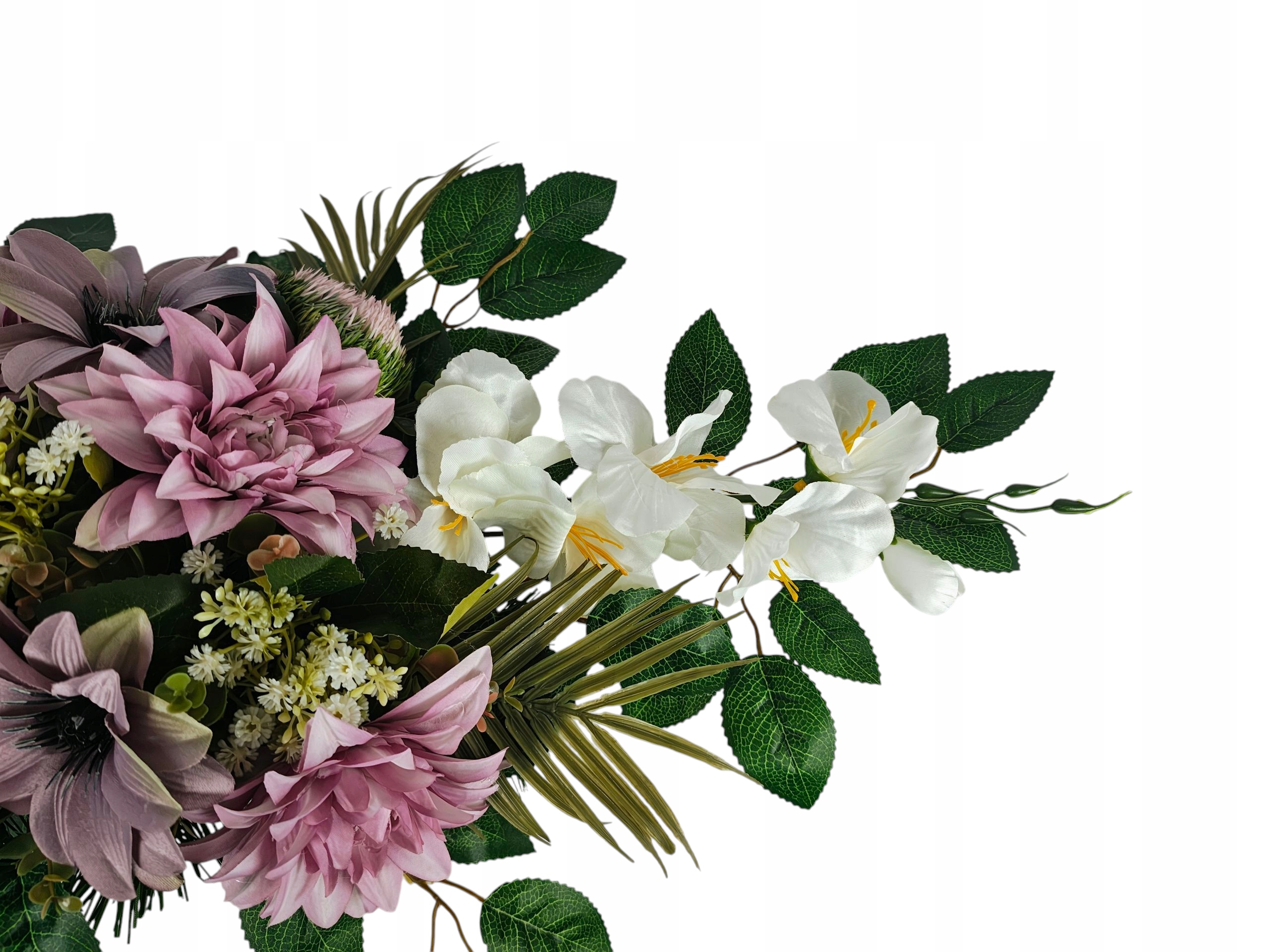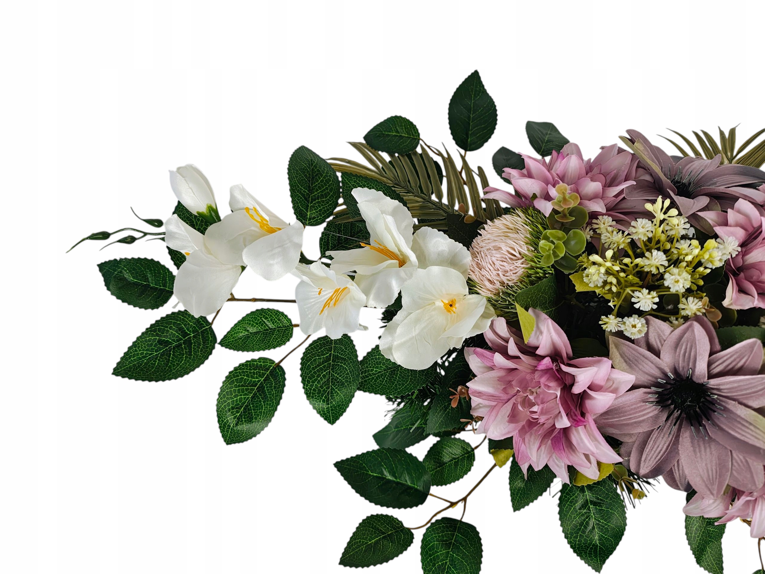 Головний убір був розроблений для гідного та красивого вшанування близьких людей. Пишна композиція значно заповнює простір на надгробному камені, створюючи виразну, але тонку прикрасу. Вставка вази була створена таким чином, щоб стабільно розмістити його в класичних надгробках, завдяки якому цілий виглядає послідовно та елегантно.