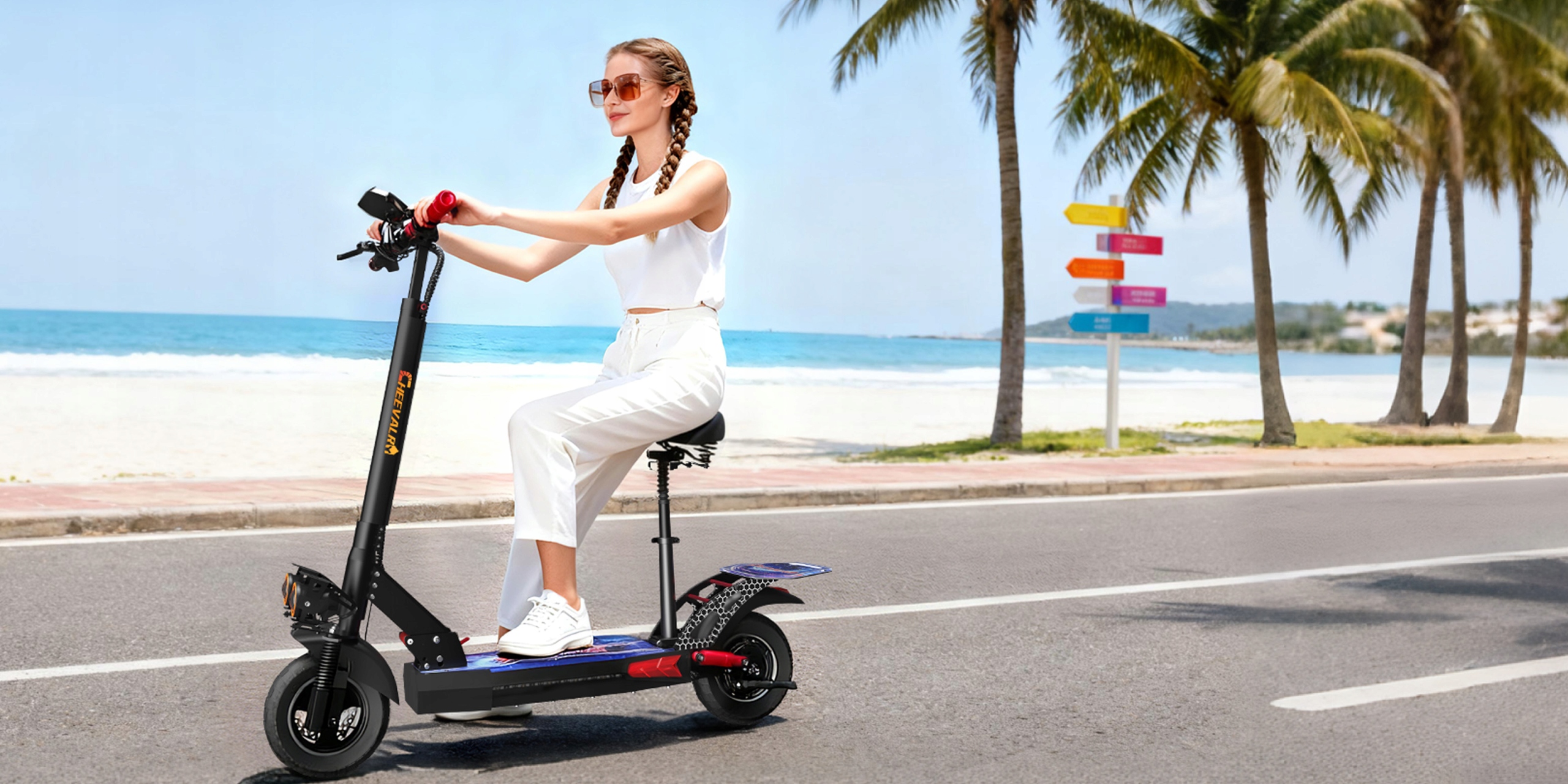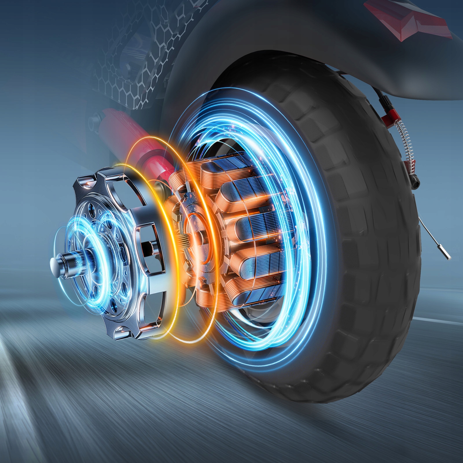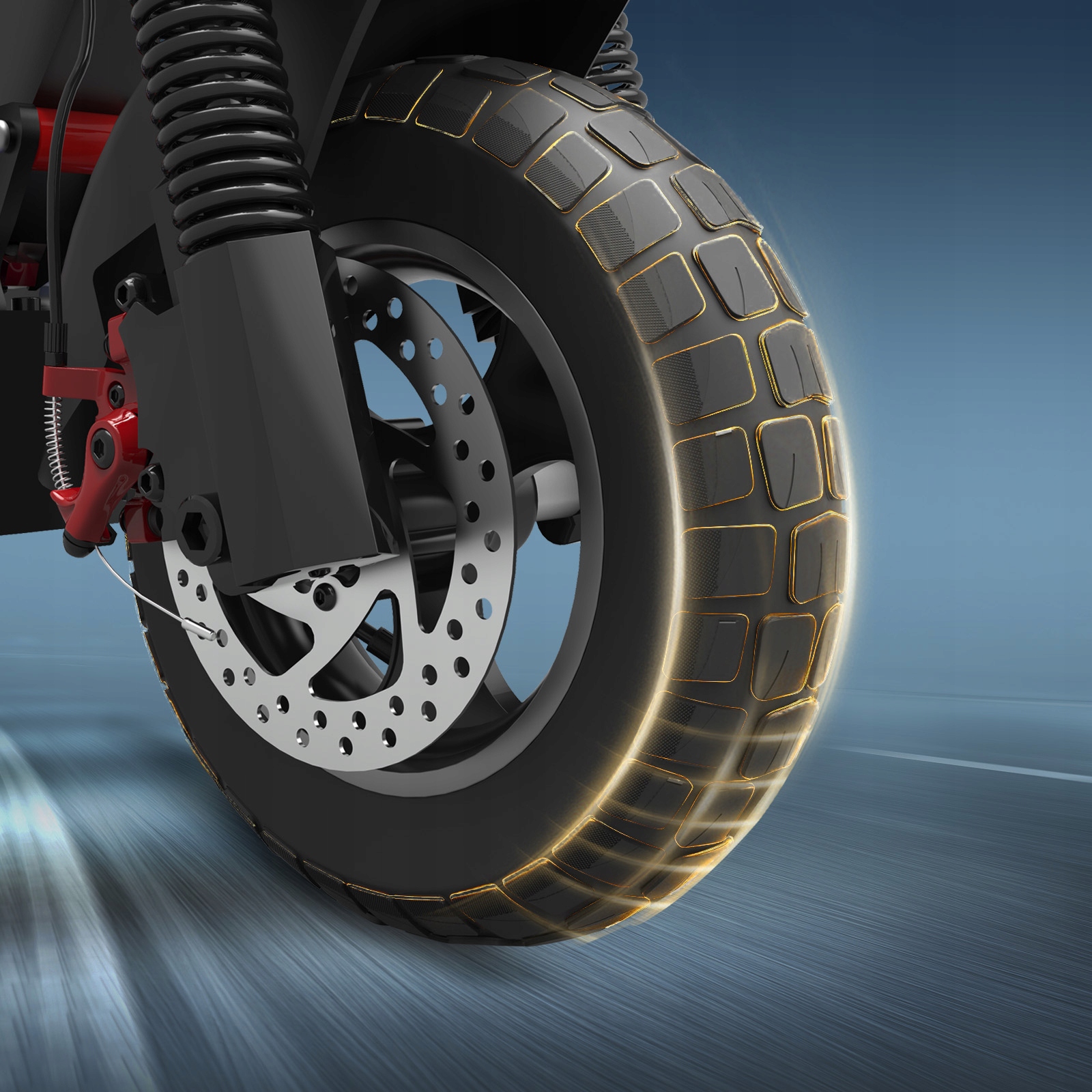 Він оснащений 10-дюймовими пневматичними шинами. Ці надзвичайно широкі шини дозволяють легко їздити містом, на пляжі, на снігу та в горах.