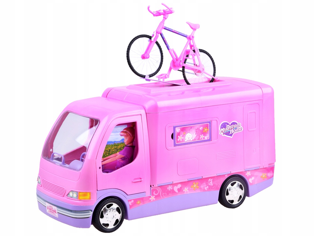 Сенсаційний великий туристичний автомобіль типу кемпер, ідеальний для довгих подорожей для всієї родини ляльок Барбі. Великий, просторий автомобіль має складні борти автомобіля, щоб створити простору кімнату для щоденного використання. Усередині автомобіля є функціональна кухня з шафами, що відкриваються, раковиною та вітальнею з диванами. Все це дуже вражаюче та ретельно зроблено, воно точно порадує кожного маленького мандрівника.