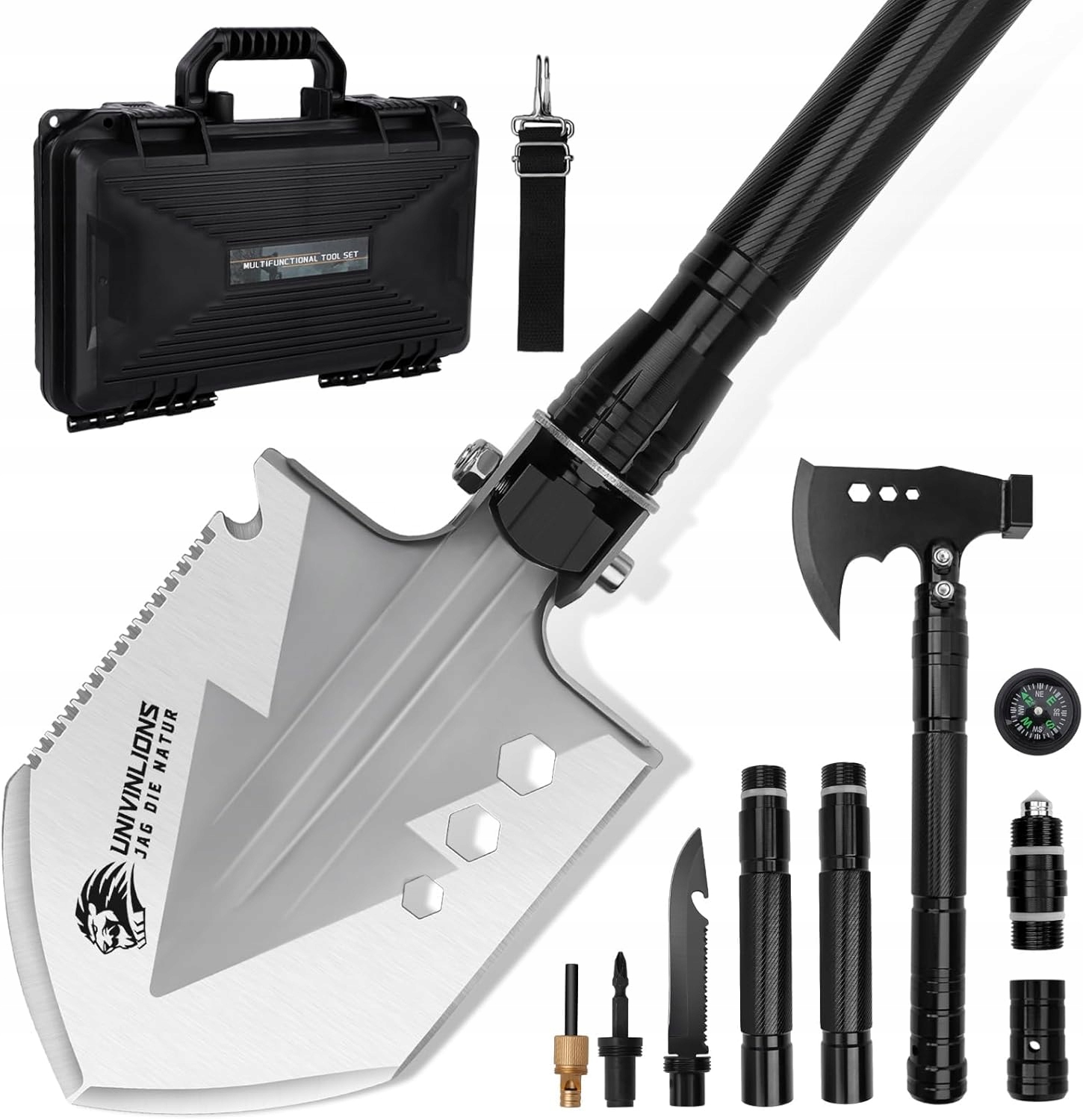 Цей виживчий набір лопатою, а сокира виготовлена з потовщеної сталі високої вуглецю 3CR1. Різке лезо та розумне кут полегшують використання. Ручка лопата міцна і легка і забезпечує зручне зчеплення. Ви можете подрібнити, розділити, молот тощо. Це ваш найнадійніший помічник назовні.
