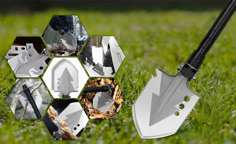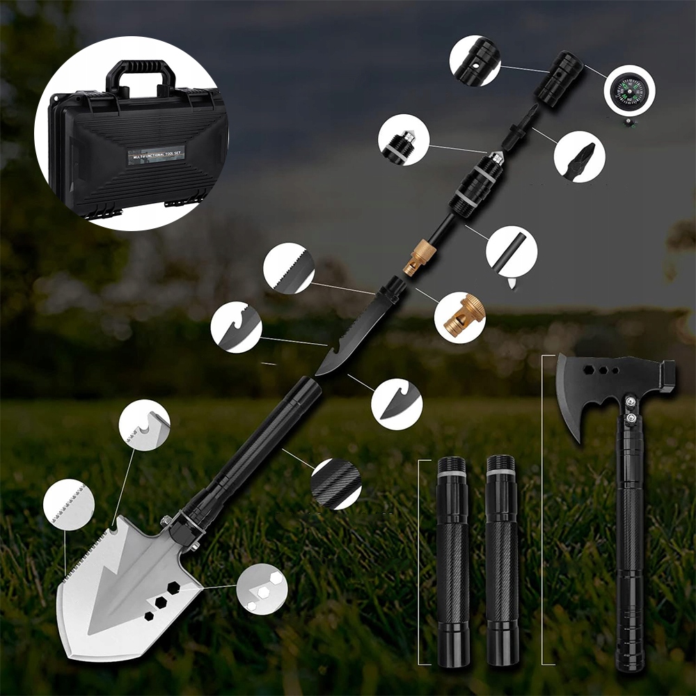 Складена лопата з головою сокири складається з лопату, голови сокири, ручки розширення та інших аксесуарів. Ви можете відрегулювати лопату виживання складання на різну довжину залежно від зростання та сценарію використання. Лопаса та голова AX видаляються та прості в установці. Підходить для кемпінгу, розвідки, подорожей на свіжому повітрі, поїздок, походів та інших заходів.