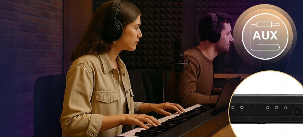 - Порти: Aux Out, Mini Jack 3,5 мм, підтримуючі педаль, USB-тип A, вхід мікрофона, вхідні вхідні навушники