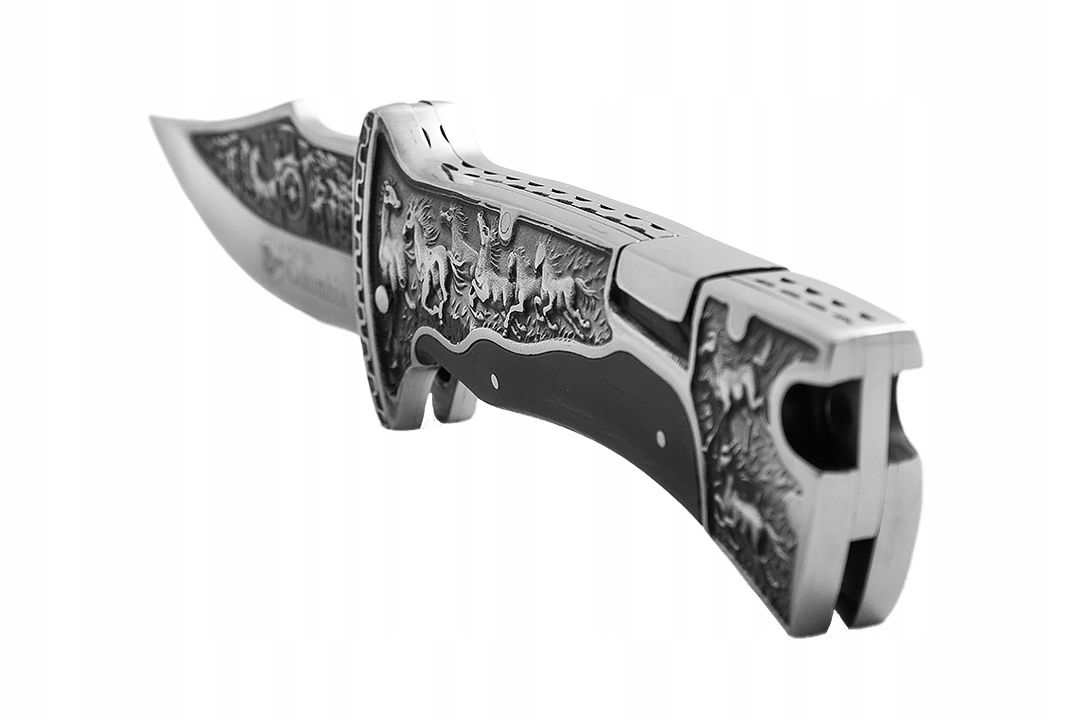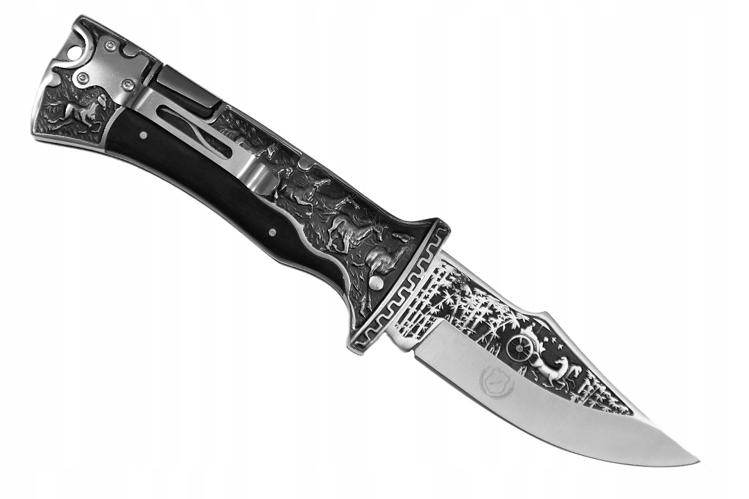 Цей надійний ніж характеризується винятковою стійкістю до всіх видів пошкоджень , а також на стирання та гонки , що робить їх незамінним супутником в кожної ситуації . із зображенням бігових коней по полях, а також чорне покриття, що надає йому унікальний вигляд.