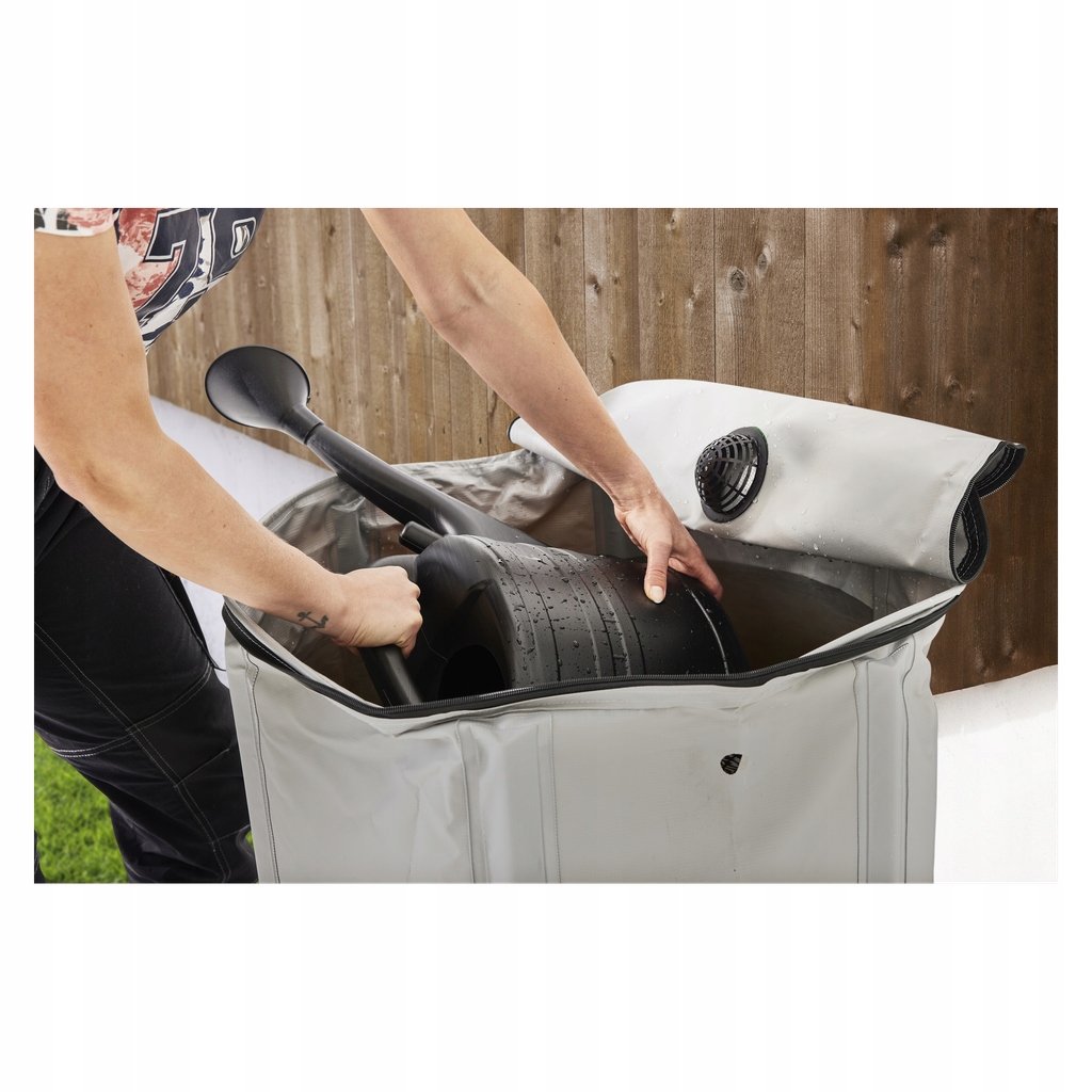 бочка виготовлена з стійкого ультрафіолетового вінілла (500d ПВХ) і постачається в обкладинці з шістьма ніжками та вищезазначеними з'єднувачами.